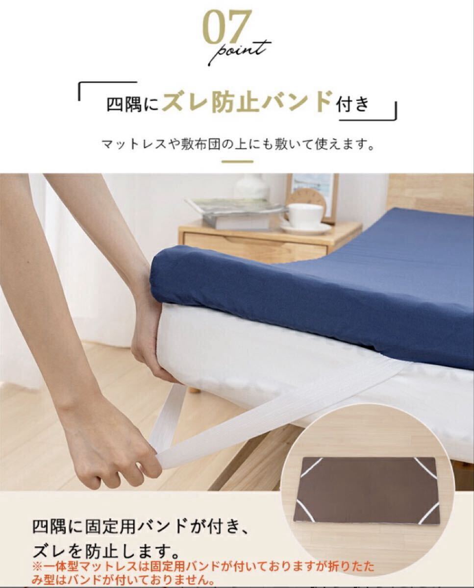 一体型マットレスは四隅に固定用バンドが付き、マットレスや敷布団の上にも敷いて使え、ズレを防止します。