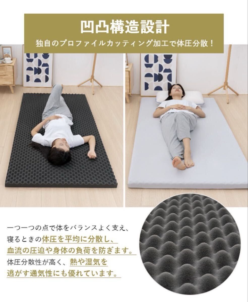 表面が凹凸にカッティングされているため、体をバランスよく支え、寝るときの体圧を平均に分散し、血流の圧迫や身体の負荷を防ぎます。身体とマットレスの間に隙間があるので熱や湿気を逃がす通気性にも優れています。
