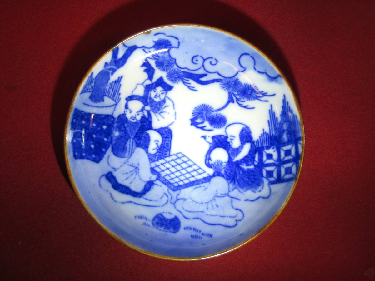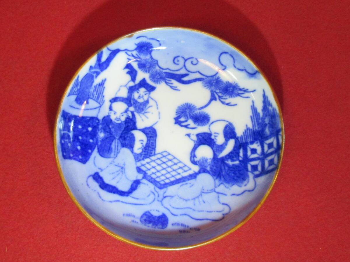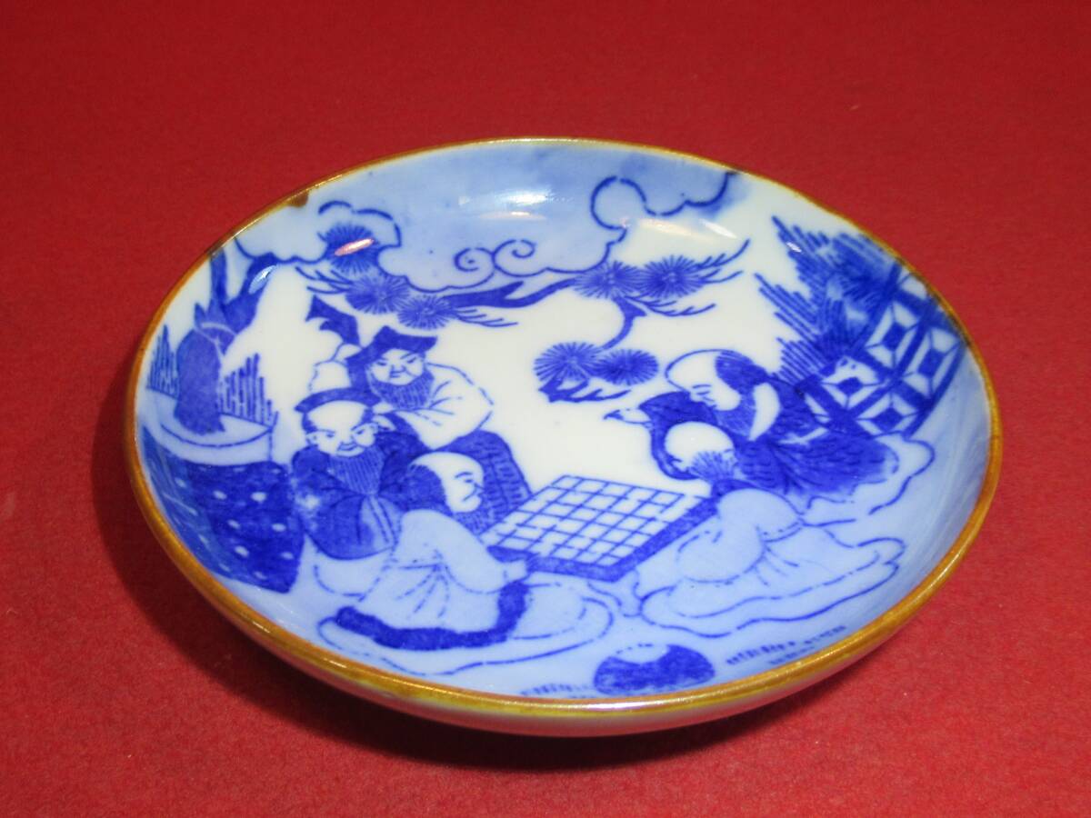 図変り印判『古伊万里染付印判松下囲碁人物文小皿② (径12,7㎝)』明治期 豆皿 銘々皿 コレクター放出品