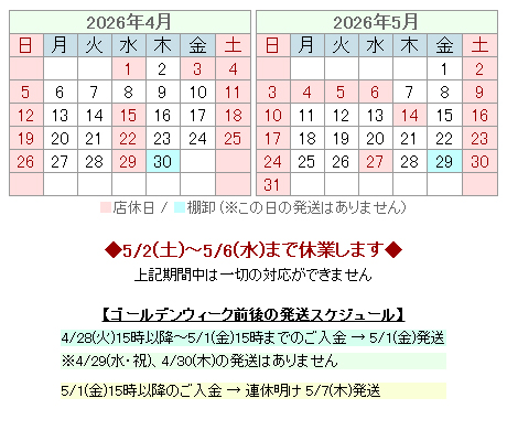 | 営業日15時に入金確認、16時~18時頃に発送となります。 午前中・店休日、棚卸日の発送はありません。 営業日15時までにこちらで入金確認が取れましたら当日発送可能です。 (15時以降及び店休日、棚卸日のお振込は翌営業日発送) 発送完了しましたらメールでお知らせいたします。 お問い合わせ番号が発行される場合は、お問い合わせ番号を通知します。 (※営業時間の関係で発送通知が遅れる場合があります) |