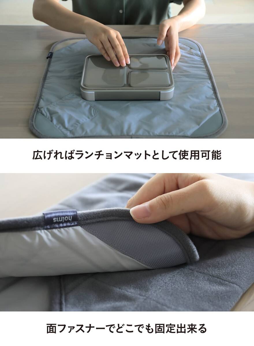 ・色々な弁当箱をしっかり包めるのはもちろん、たくさんの機能を兼ね備えています。下に敷けばランチョンマットになったり、保冷剤や調味料を入れるポケットが付いていたり。