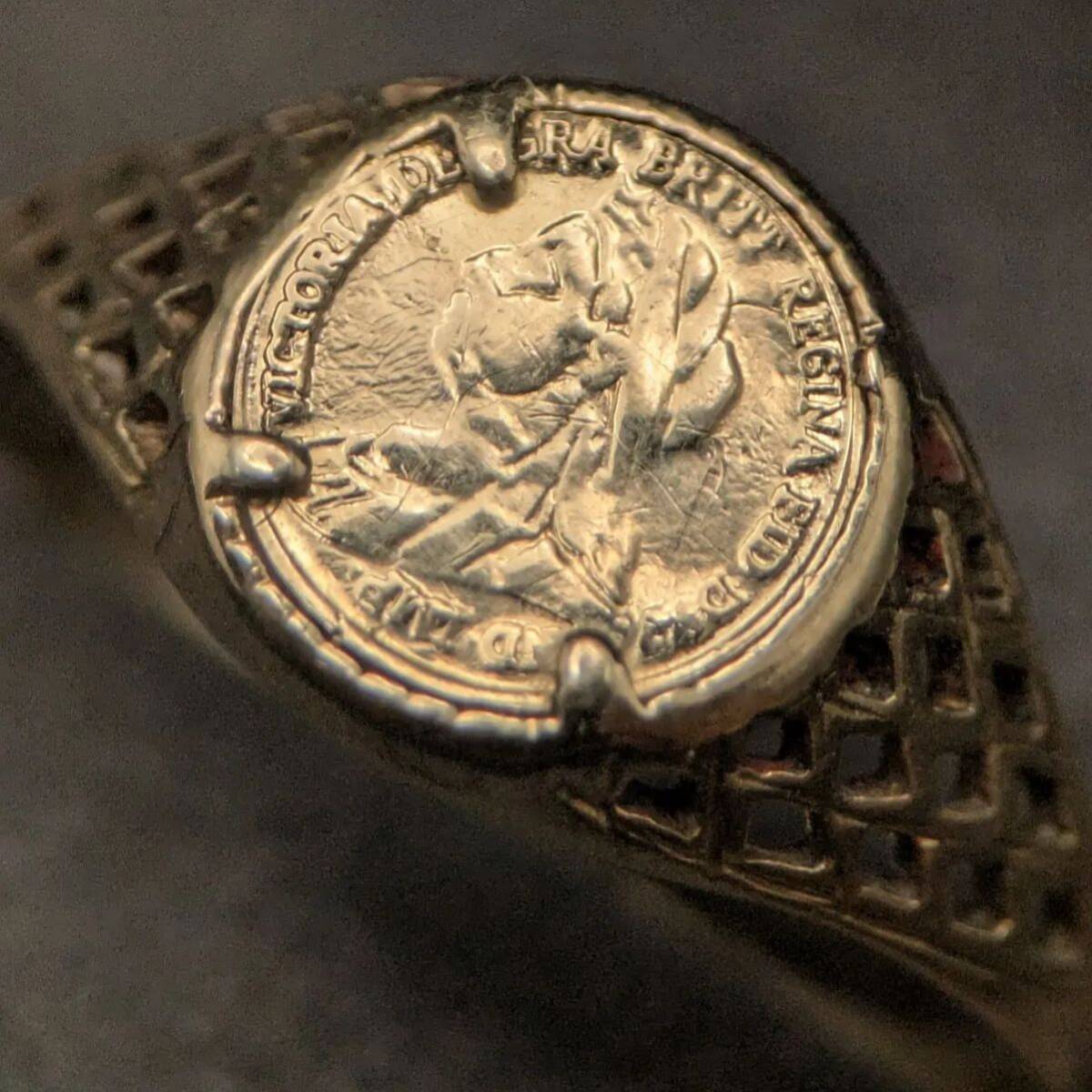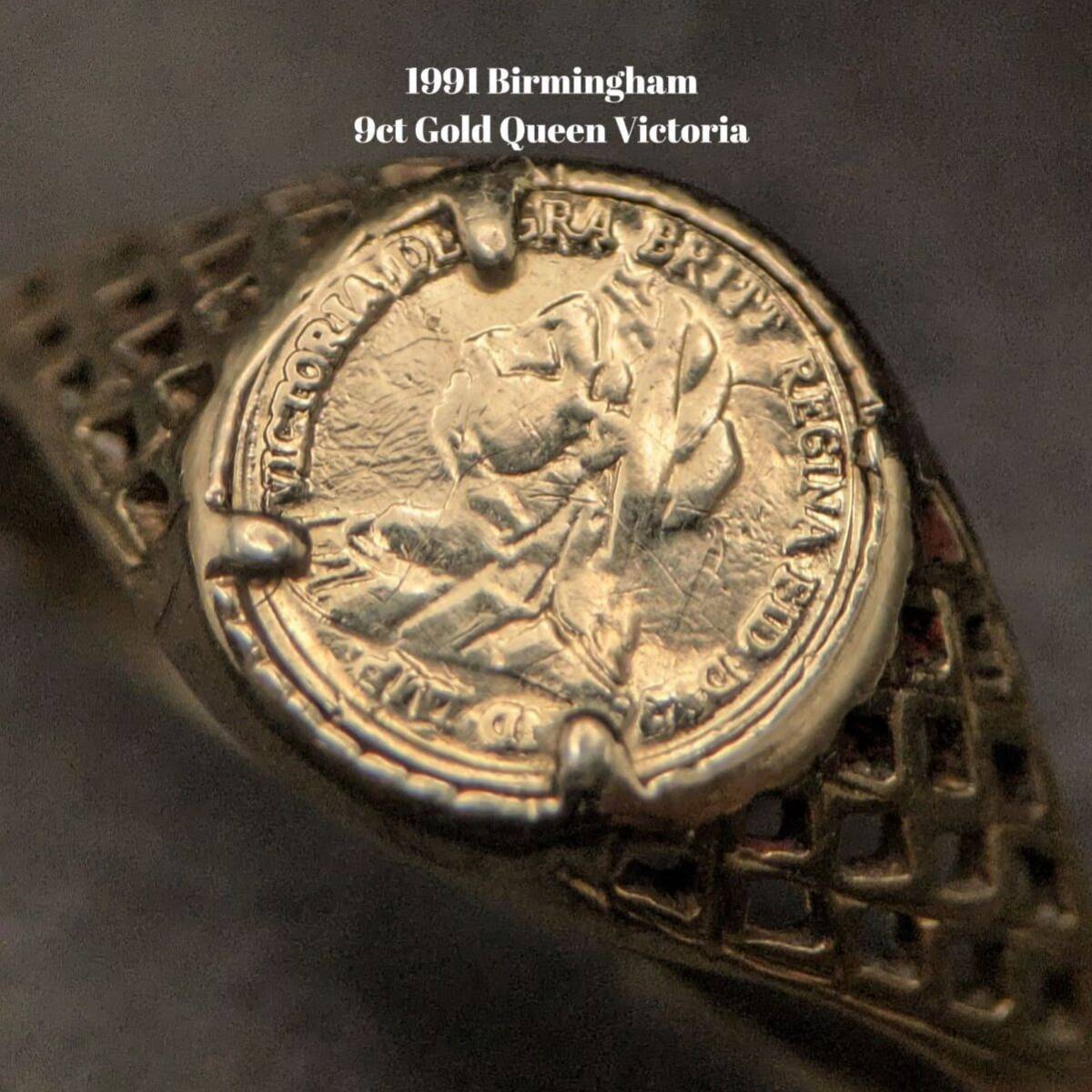 1991年に英国バーミンガムのアセイオフィス(Anchor=錨)で検定を受けた、9カラットゴールド(9K / 9ct / 375)のクイーン・ヴィクトリア・コインリングです。