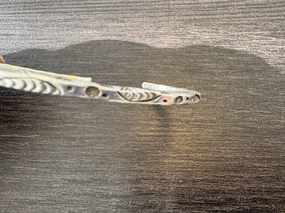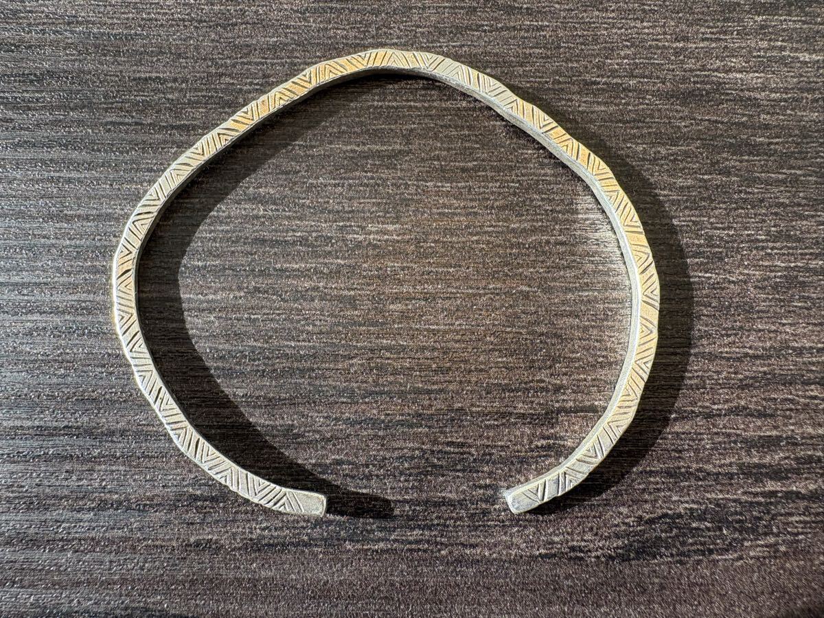 シルバー製の細身バングル、彫刻と幾何学模様が特徴。