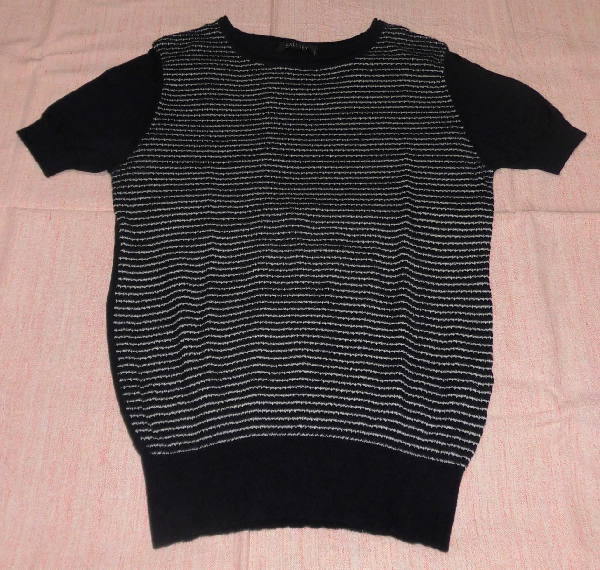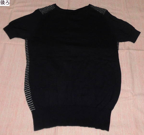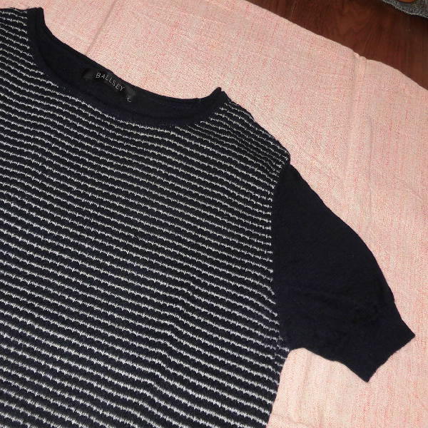 | 数回使用しましたが、比較的キレイです。 ☆ サイズ表示はないのですが、Mくらいだと思います ☆ 色は紺、前身頃のみ白のボーダー柄 ☆ 実寸は、身丈57センチ、肩幅34センチ、袖丈18センチ、 脇下の幅39センチ、裾幅25センチ ☆ 綿70%、アンゴラ30%、薄手 ☆ 丸首 ☆ 首周りはくるんと丸まったデザイン ボールジィー トゥモローランド | ||