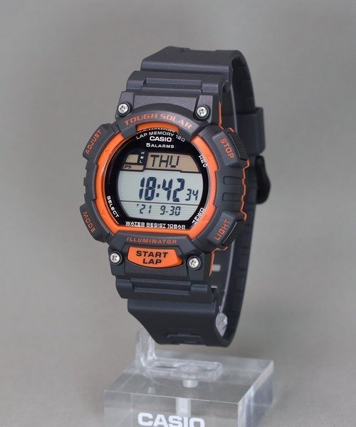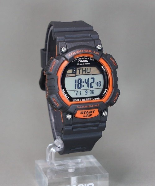 Casio Collection SPORTS(カシオコレクション スポーツ) 太陽光や蛍光灯などの光を動力に変えるソーラー充電システム「タフソーラー」を搭載したスポーツウオッチです。 専用の大型フロントボタンの採用により、操作性にもこだわった120本メモリーのラップ・スプリットタイム機能を装備。 更に、天候を気にせず使用可能な10気圧防水機能を搭載しました。 ・ タフソーラー(ソーラー充電システム) ・ ワールドタイム:世界48都市(31タイムゾーン、サマータイム設定機能付き)+UTC(協定世界時)の時刻表示 ・ ストップウオッチ ・ タイマー ・ 時刻アラーム5本(1本のみスヌーズ機能付き)・時報 ・ ケース・ベゼル材質:樹脂 ・ 樹脂ガラス ・ 樹脂バンド ・ 10気圧防水 ・ LEDライト(残照機能、残照時間切替(1.5秒/3秒)付き) ・ LED:アンバー ・ ケースサイズ(縦×横×厚さ):51.4 × 46.8 × 14.5mm ・ 質量:41g 付属品:エコパッケージ |