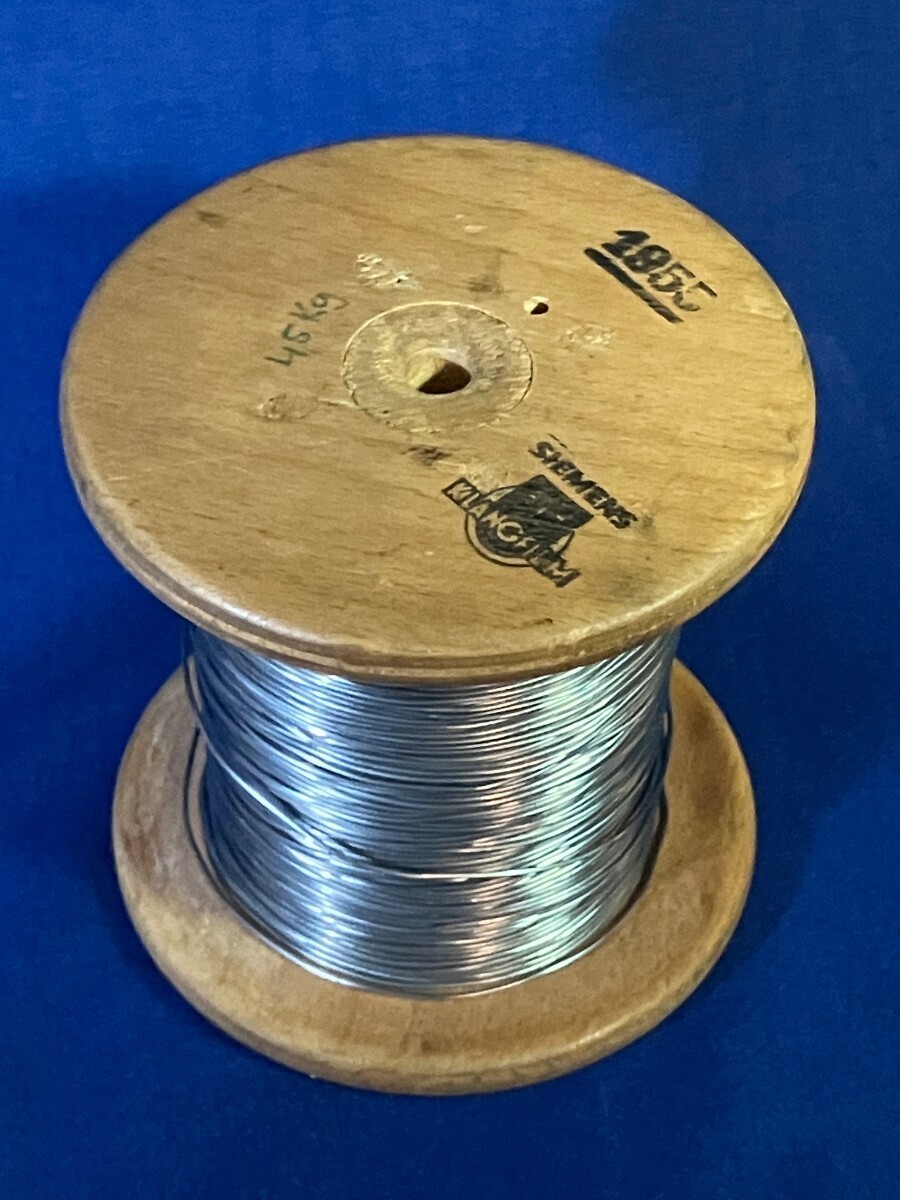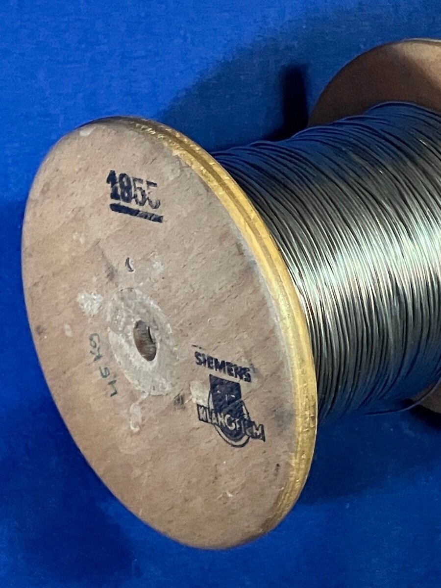 よく、KLANGFILMのハンダを扱うと、フラックスレスのものが本物である、、云々と聞きますが、とんでもない。ほんの僅かの期間だけ製造されたシングルコア入りハンダが、ここに現存しています。10ポンド巻きのこの無骨なハンダは、60年の時を経ても腐食の黒ずみが微塵も見られず、今も艶やかに輝いています。この度の販売は、所有者のO氏のご好意によるもので、ハンダのコレクターでもある氏によると、このリールを所有する人は自分の他に日本には1人だけでありあと韓国に1人、香港に1人だけだと聞きました。世界に、たつたの4巻、約12kg弱しか存在しない、大変貴重なハンダです。