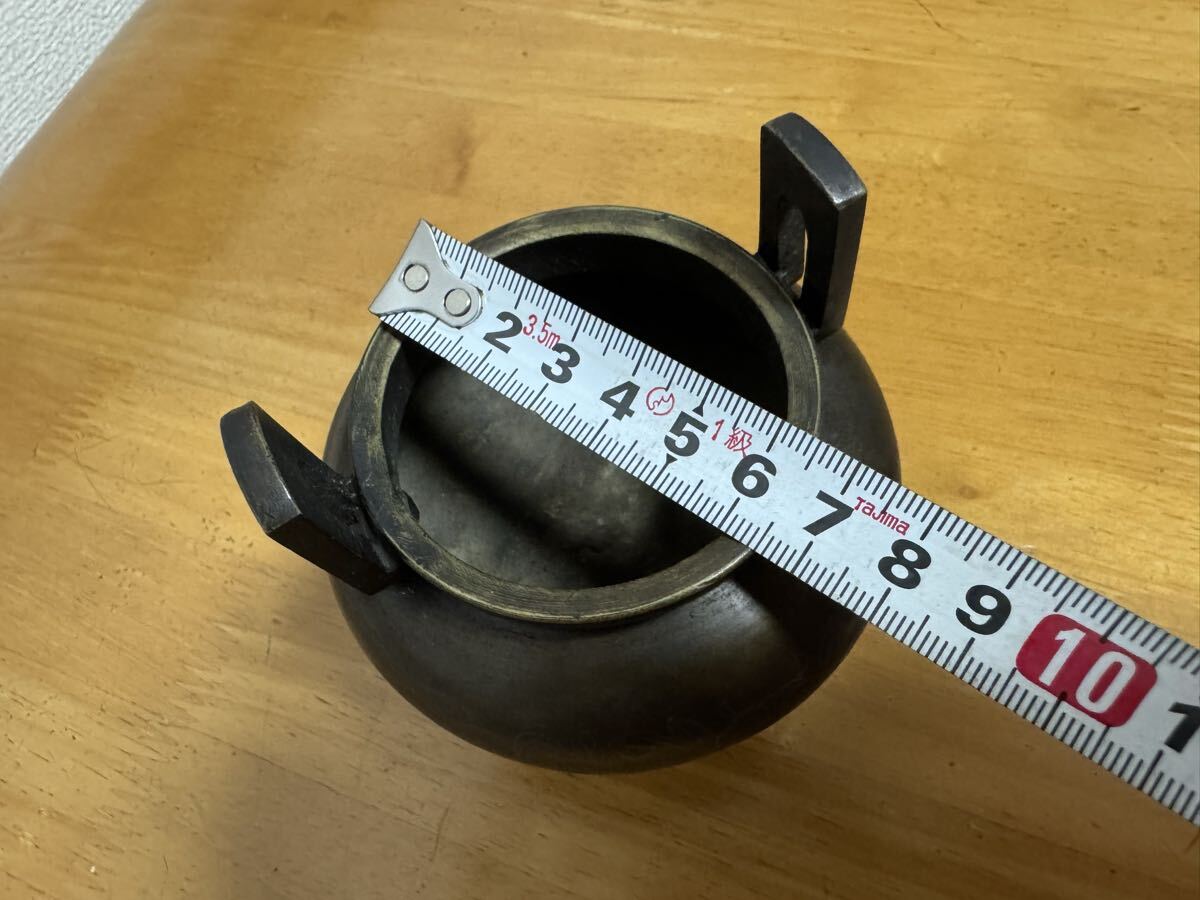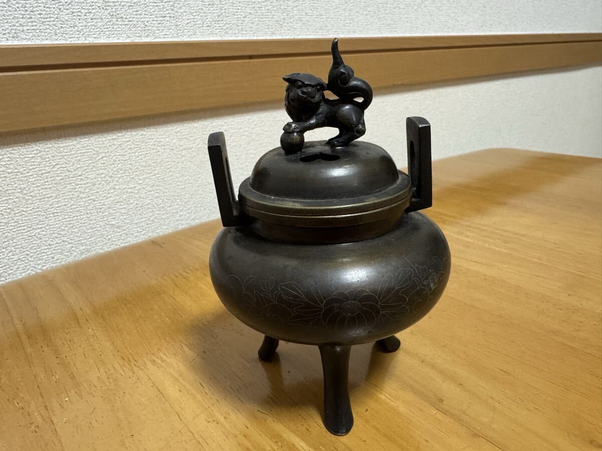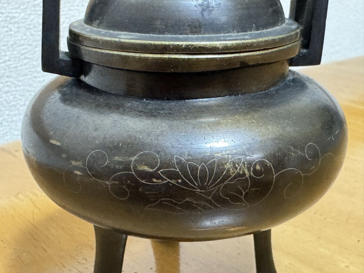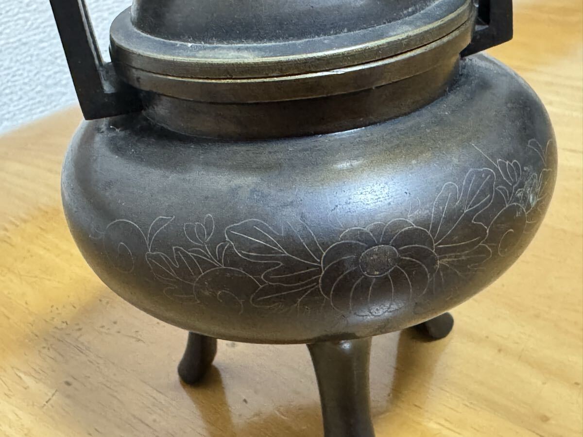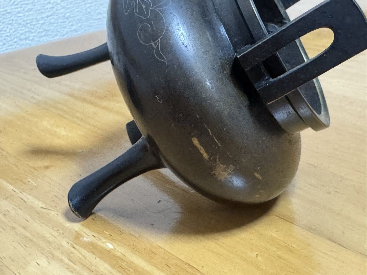 金属製 獅子摘み耳付き三脚花唐草紋様香炉 茶道具 アンティーク 金属工芸