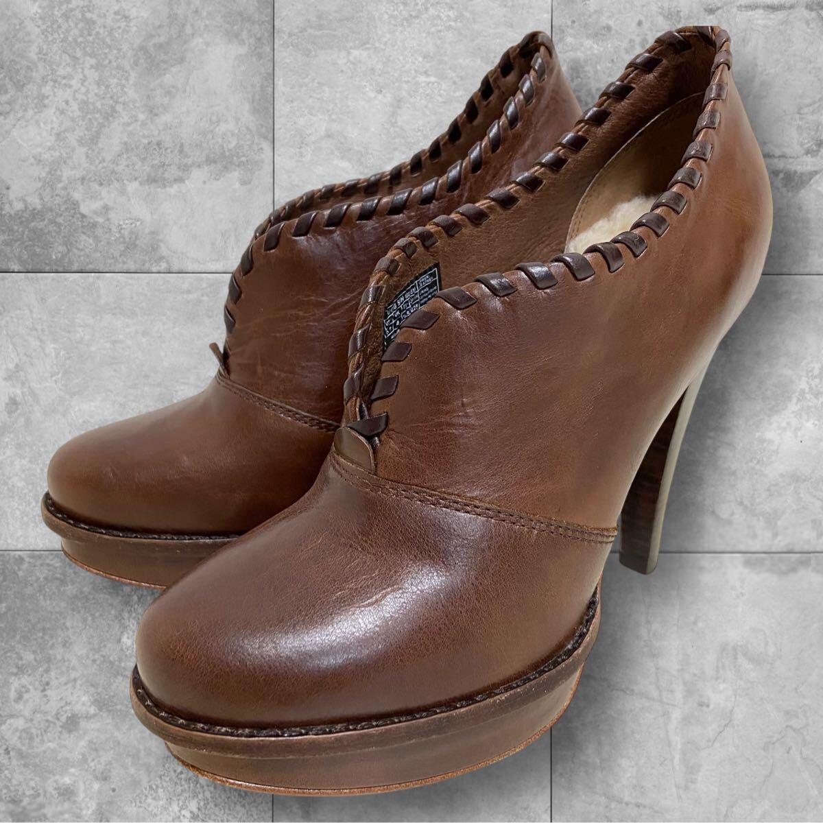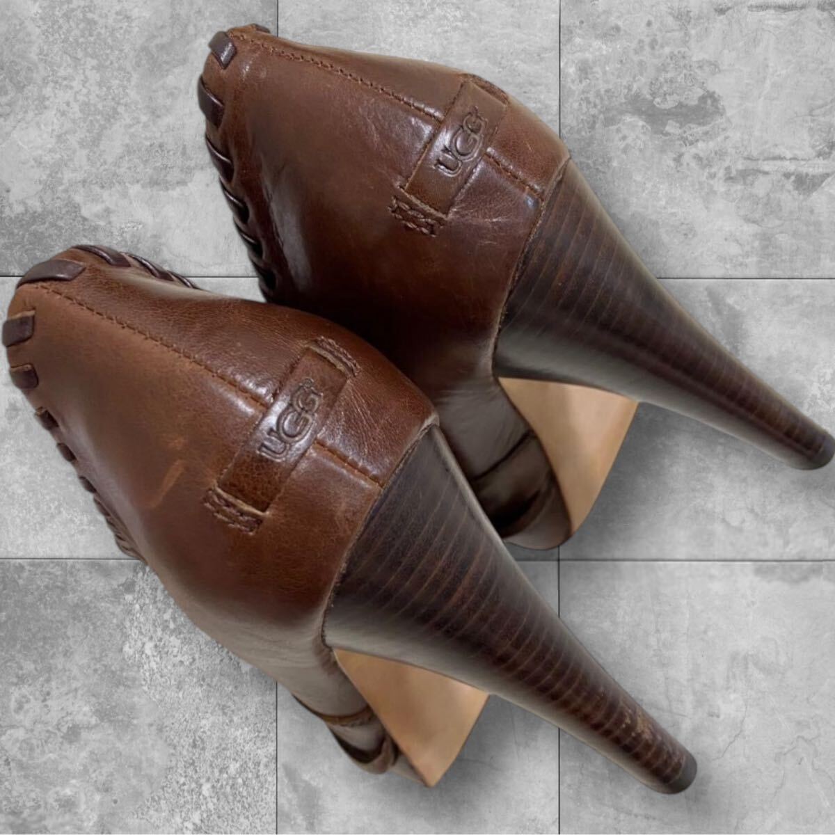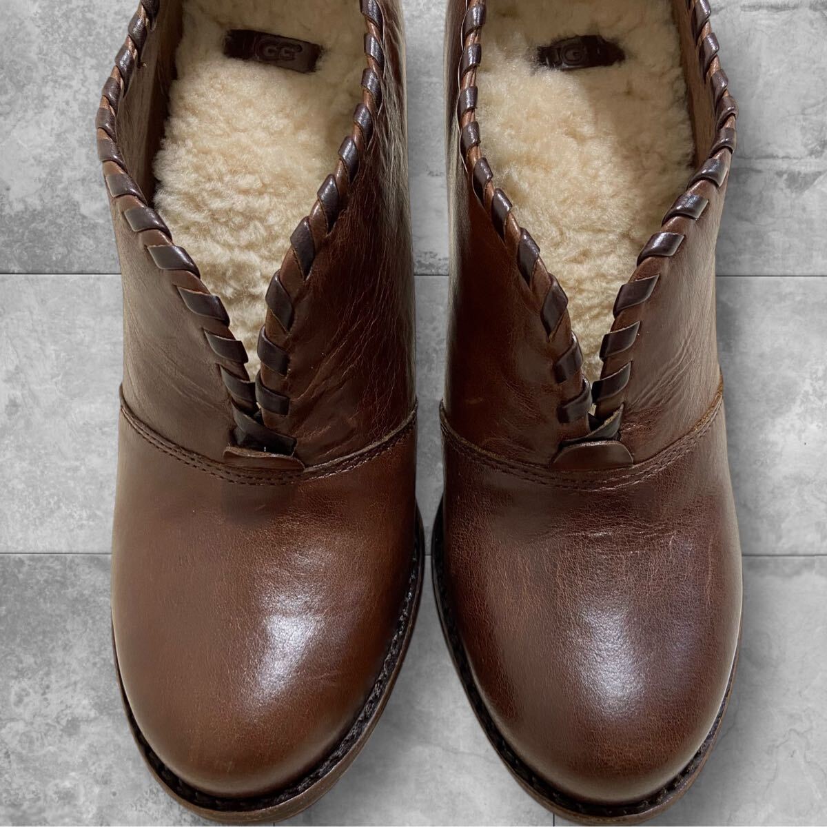 アグのヒールブーティ。モデルネームはジャミソン。完売品。参考定価3.3万。選び抜かれたリアルレザーを贅沢に。本革にしかない繊細な表情と独特の存在感が魅力。フロントV字カットなど考え抜かれた美シルエット。アグお得意の羊革リアルムートンインソール。カラーはブラウン。正規品。簡易清掃済。オイルメンテナンス&簡易清掃済。