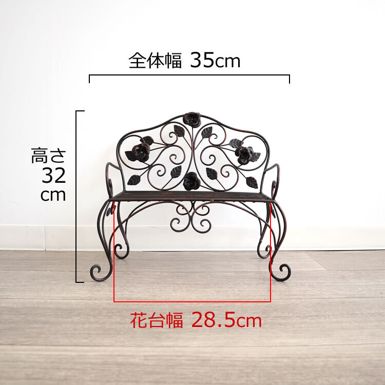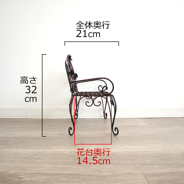背もたれ部分にローズのモチーフがデザインされています。小物や、小さな鉢植えなどのディスプレイにお使い頂けます。