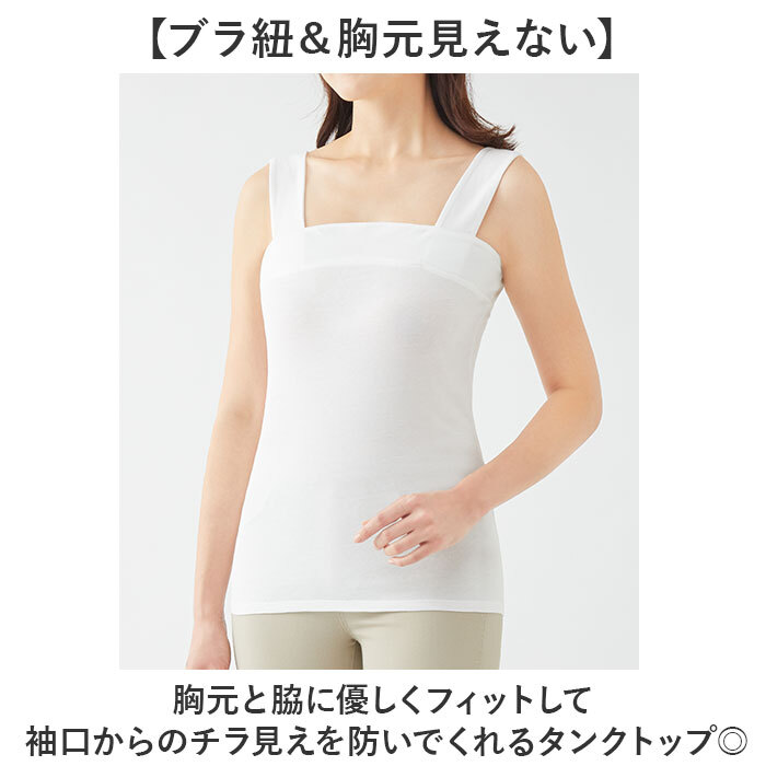 | 商品説明 | ・・【ブラ紐&胸元見えない】 ・胸元と脇に優しくフィットして袖口からのチラ見えを防いでくれるタンクトップ◎ ・【動いても安心】 ・腕を上げても前かがみになっても浮きにくい安定した着心地〇 ・【太めの肩紐】 ・幅広の肩紐でブラ紐をしっかり隠せて下着も見えにくい仕様。 ・【快適な着心地】 ・吸汗性に優れた綿100%生地を使用し、優しい肌触り♪ ・【着回し自在】 ・インナーにも単品にも使える万能タンクトップ! |