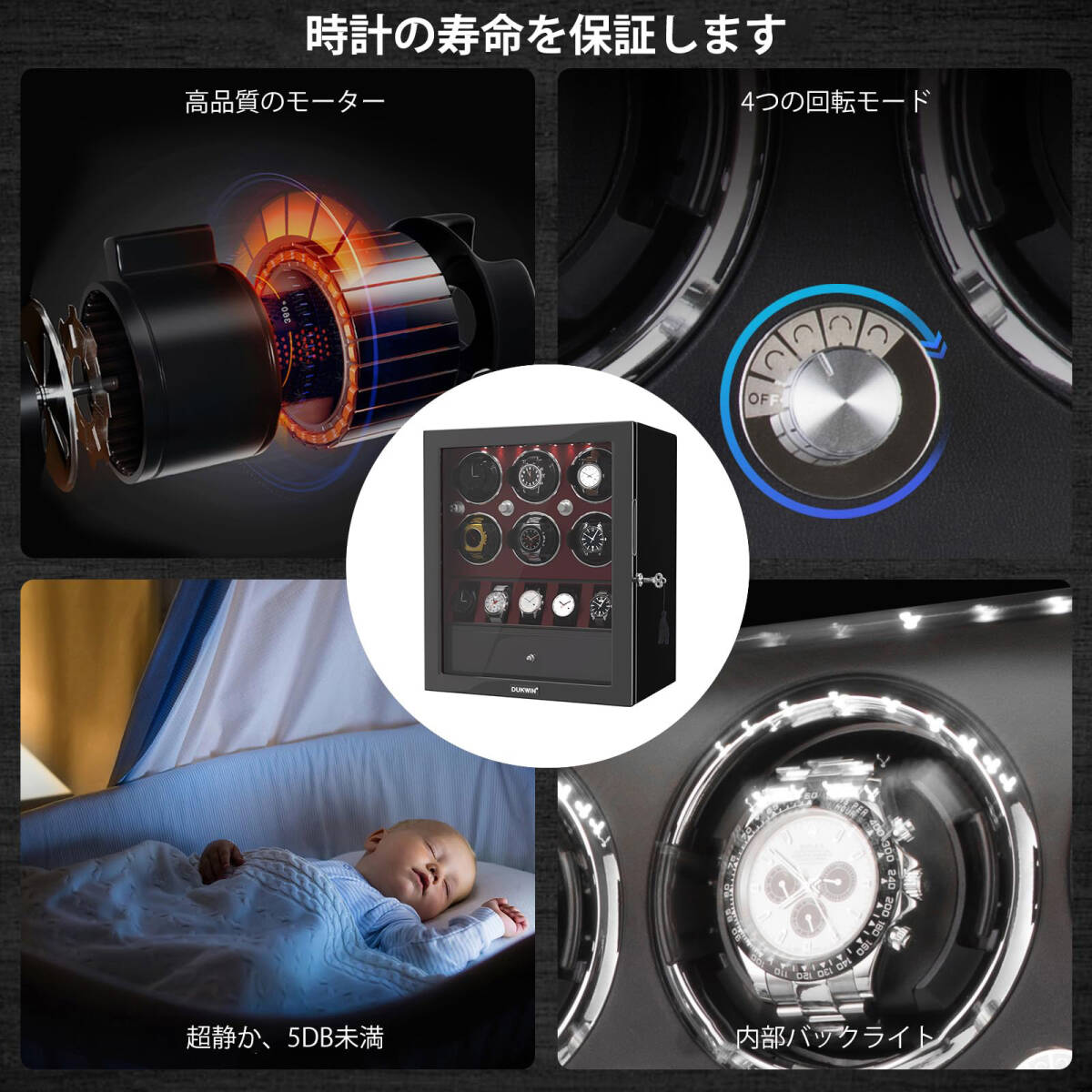 また、4種類の回転モード(時計回り・反時計回り・交互回転・間欠回転)を備え、ほとんどの自動巻き腕時計に対応可能です。