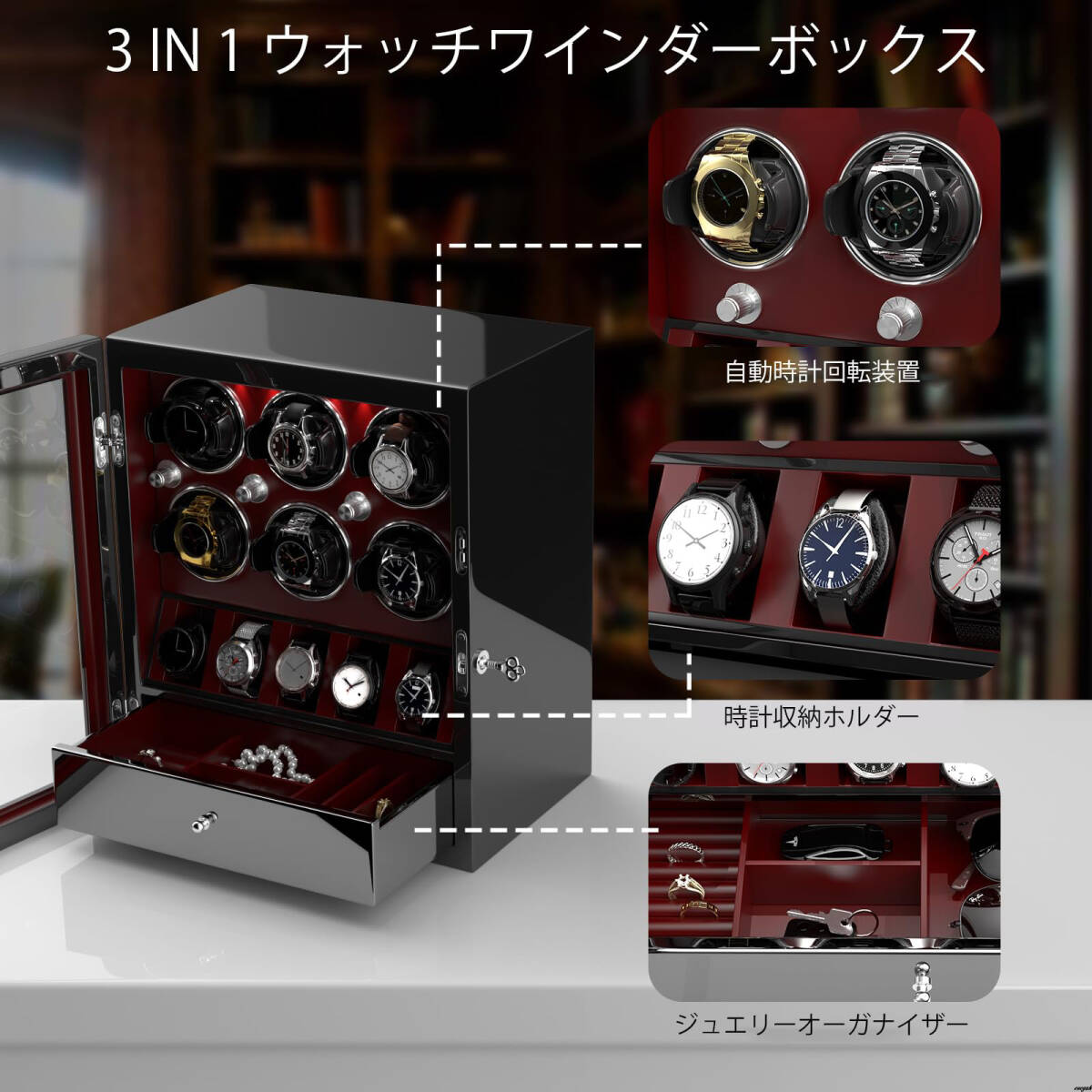 【引き出し付きで小物やジュエリーも整理できる】 ワインディングマシーン 6本巻き 腕時計収納ケース 静音設計 LED照明付き レッド