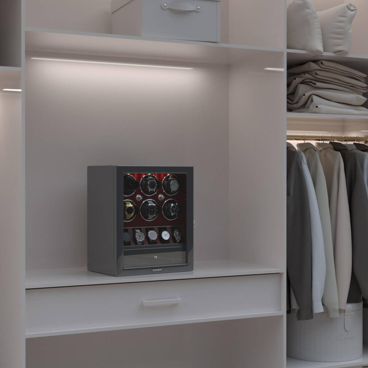 引き出し付きの設計により、腕時計だけでなく小物やジュエリーも整理でき、コレクションの管理に最適です。