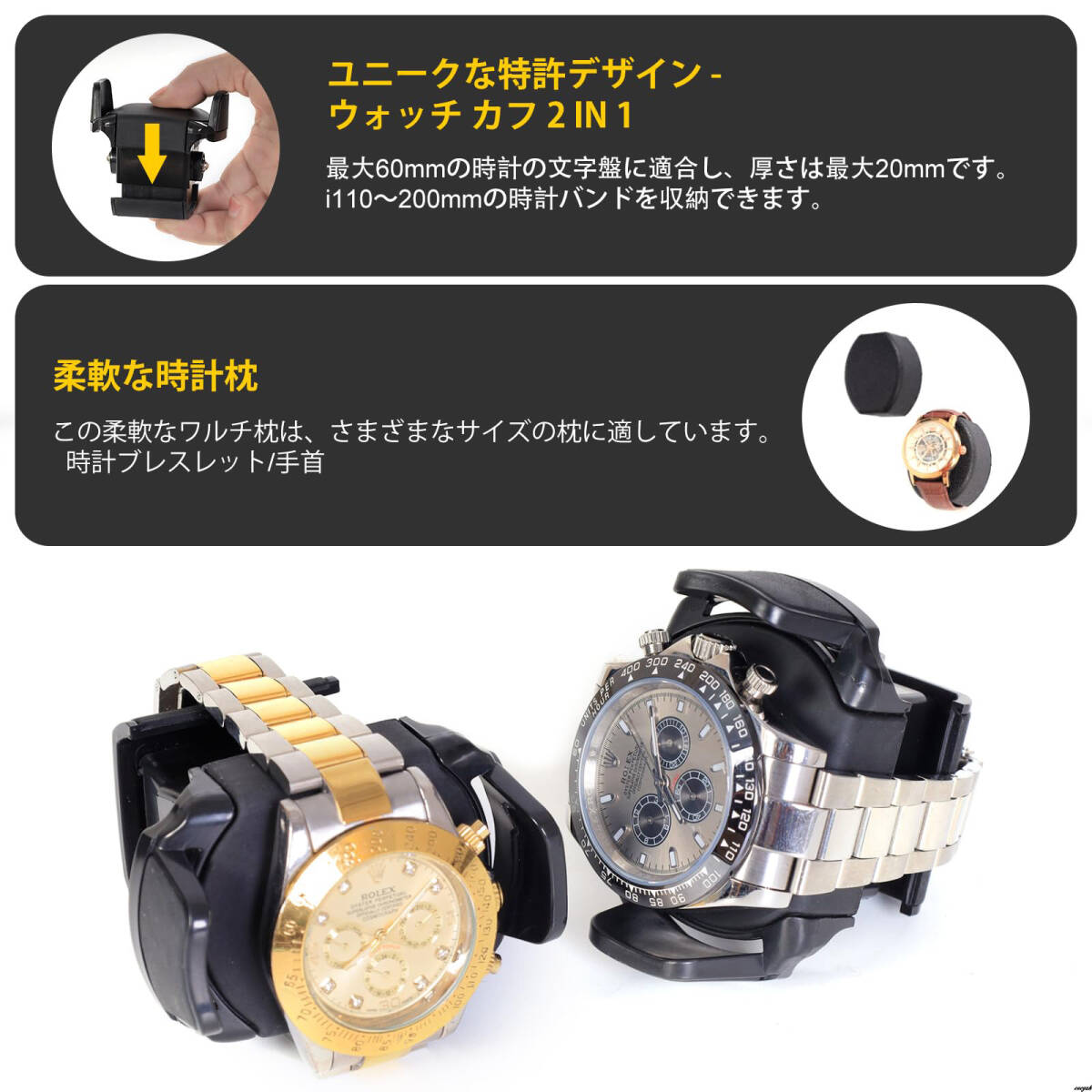 バネ式の柔軟なクッションは、男女問わず110〜200mmの腕時計バンドに対応し、コレクションを優しく保持します。