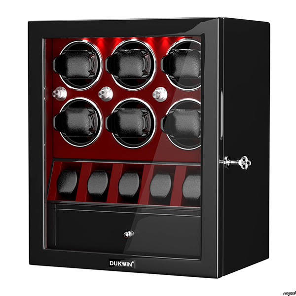 このワインディングマシーンは、6本の自動巻き腕時計を同時に巻き上げ、さらに5本分の通常収納スペースを備えた大容量モデルです。