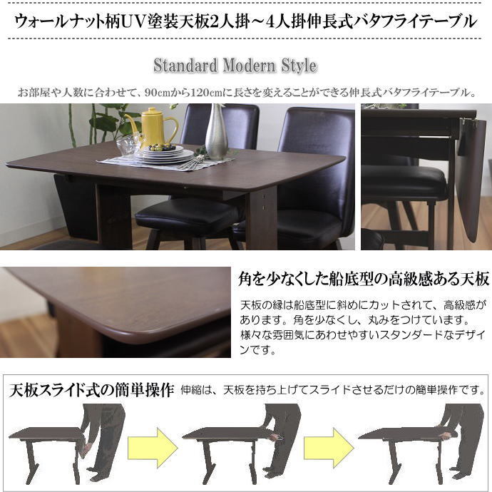 | 【商品特徴】 | ◇伸長式バタフライテーブルの単品販売です。 ・お部屋や人数に合わせて、2人掛サイズの90cmから3人~4人掛サイズの120cm×75cmに長さを変えることができる伸長式バタフライテーブルです。 ・天板をスライドするだけの簡単操作で、伸長できます。 ・天板の縁は船底型に斜めにカットされ高級感があります。角を少なくし、丸みをつけています。 ・様々な雰囲気にあわせやすいスタンダードなデザインです。 ・ナチュラル感あるウォールナット木目柄転写シートに擦り傷がつきにくいUV塗装を施した天板です。 ・着座する際に出入りがしやすいT字型の脚。ラバーウッド無垢材を使用したブラウン色で、天板を水平に保つことができるアジャスターが、脚裏に付いています。 ・脚の両サイドに木製フックが付いて、専用のベンチが収納できます。 ・お客様で脚部のお取り付けが必要です。(説明書を同梱しております。) | |