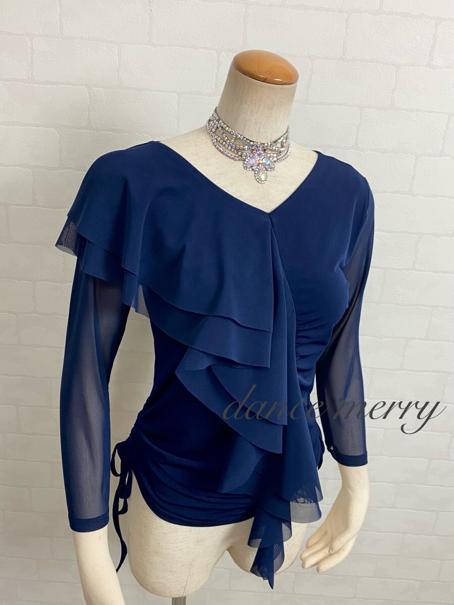 トップスはストレッチ素材をベースに軽いメッシュのフリルを2段あしらった華やかな逸品。