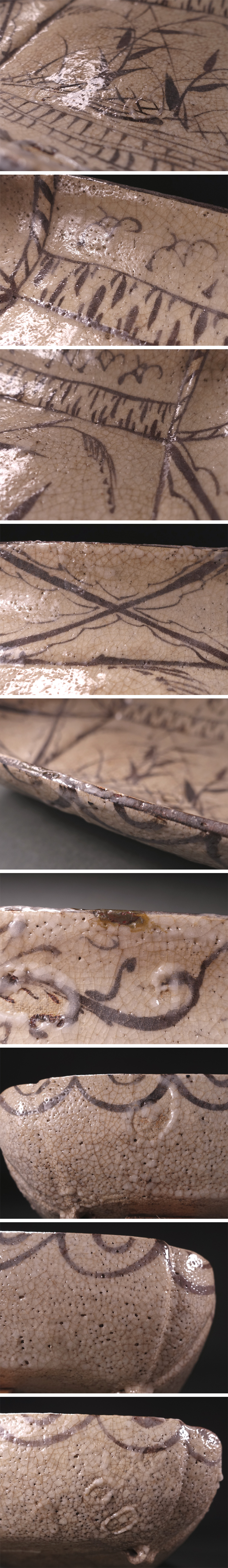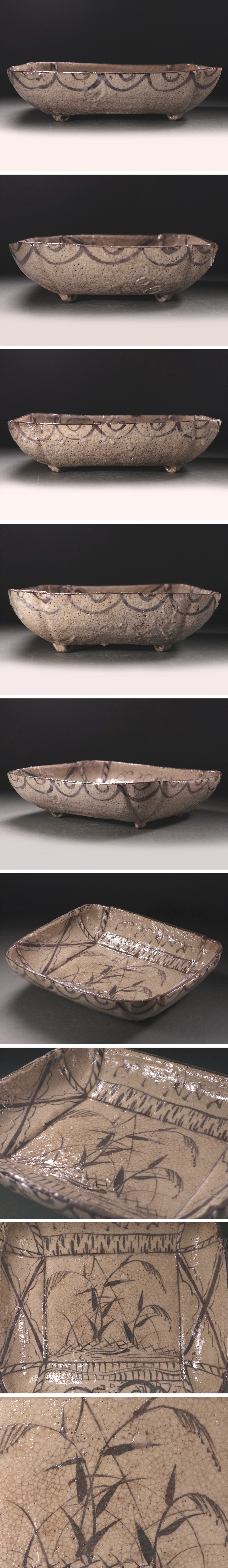 器の内外に鉄絵で意匠された方形の鉢で、器内では秋草文を主題として周囲に幾何文様を配し、口辺には花丸文様を縁取っています。