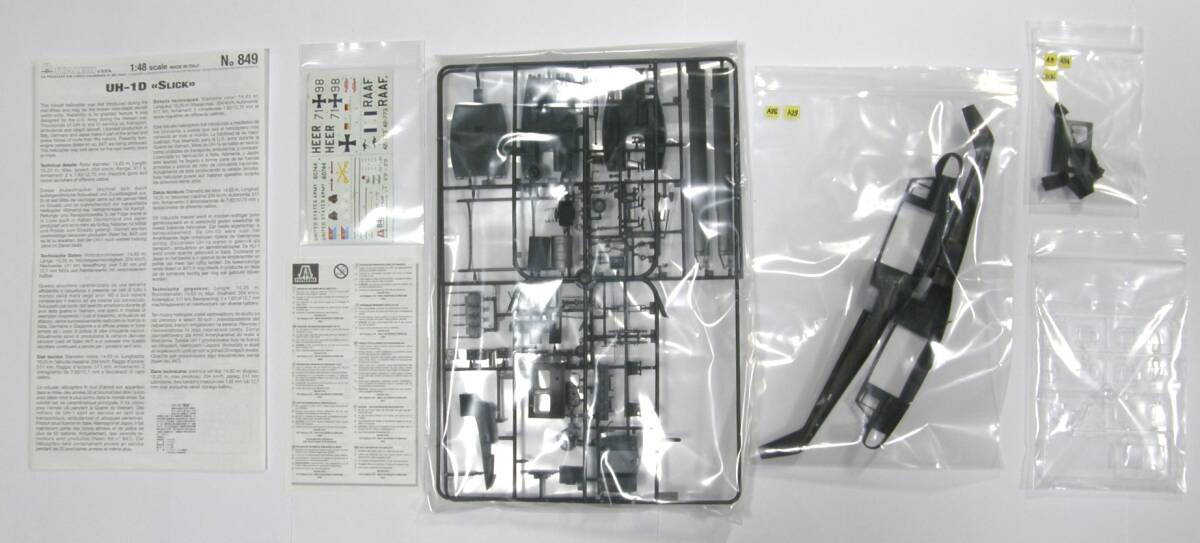 | 【商品説明】 ・商品名称:UH-1D スリック アメリカ陸軍ヘリコプター(1/48スケール No 849) ・ブランド: ITALERI イタレリ ・発売日:1998年 ・「ITALERI イタレリ」製「ベル UH-1D イロコイス」の1/72スケールキットです。 1990年代に販売されたもので、本キットが初版になります。 以降、2016年までの間に「ITALERI イタレリ」社のキットをベースとして、デカールやパーツの差し替えなどにより、以下の3機種が計8種類のパッケージで販売されました。 ①「UH-1D」:「UH-1A/B」の改良型。胴体を延長しキャビンを大型化した民間モデル「ベル モデル205」をベースにアメリカ陸軍向けに仕様変更。 ②「UH-1H」:「UH-1D」をベースにエンジンを換装した型。 ③「アグスタ / ベル AB 205」:「UH-1D」のライセンス生産版で、イタリアのアグスタ社が製造。 ・上記キットの金型は全て「ITALERI イタレリ」社のものをベースとしており、初版以降の販売元は「Italeri」社、「Revell」社、「Flying Kiwis」社、「Academy」社、「DF HeloStuff」社、以上の計5社になります(2025/10/20現在)。 ・「Italaerei」社はイタリアのメーカー「ITALERI イタレリ」社の旧社名です。同社は1962年に設立された老舗メーカーで、陸海空問わず様々なアイテムを多数販売してきました。非常に品数が豊富であり自社製品も開発していますが、OEM供給による他社メーカー金型のものも多数販売しています。このため、同社オリジナル製品がどれにあたるのか、あるいは購入を検討しているキットの金型がどこのメーカーなのか、気になる向きは購入前に事前確認することをお勧めいたします。 ・「Italaerei / ITALERI イタレリ」社のキットは、航空機関係に関して、初期のキットは凸モールドながらアウトラインの捉え方が良い感じで、コクピット内部については必要最低限のパーツのみ用意する潔さです。このためパーツ数は全体として抑えられています。 ・同社キットのパーツの整合性は基本設計がしっかりしているようで、新旧製品共に良いものが多いです。ただ古いキットに限っては、経年劣化による事後変形や金型自体の経年劣化などで、パーツ変形やバリが目立つものもあります。 もともとの作りはしっかりしていますが、流石に年月には勝てないようです。 このためオールドキットを制作する場合には事前の仮組みチェックは必須で、必要に応じてパーツの擦り合わせ作業も行う場合があります。それもオールドキットの楽しみ方のひとつなのかもしれませんが...。 ・近年の同社製開発キットはモールドが筋彫りのものが多くなりました。本キットは1990年代後半のもので、パネルラインには筋彫りが施されています。やや深め太目な彫りは好き嫌いがわかれるかもしれませんが、メリハリのあるものです。ディティールはスケール相応、及第点に達しているものが多いです。 それでもキットによっては、ナナニイクラスでも計器盤やサイドコンソール類などをリアルにモールドしていたりします。 全てのキットがそうかといえば、違ったりもします。 様々な国の模型を作っていると、各メーカーがどこに拘りをもってキットを開発したのかがわかって大変興味深いです。 ・同社のキットは超絶的なモールドではありませんが、ある程度の標準レベルを保っており、価格も他社に比べて割とリーズナブルなところが魅力だと思います。 ・本キットはコクピット内部が再現されており、計器類やセンターとオーバーヘッドコンソールの機器、スイッチ類が、シートにもシートベルトがモールドされています。また機内隔壁部や天井のキルティングの表現などもリアルに再現されています。 ・ベトナム戦で多く使用された機体ですが、初期の機体では、のちの機体では取り付けられているフロントガラス部右側上、中央フレーム角部にある三角状の小さなフレームが無いものがあります。キットはこのフレーム付きの機体を再現しており、パーツにもこのフレームがモールドされているので、製作機体により不要な場合はこのフレームを削りとることで実機通りのキャノピーとなります。 ・デカールは計3機種分がセットされています。 <デカール> ・オーストラリア空軍 No. 9 Sqn. 「48-773」 1970年 ベトナム Vietnam War ・ドイツ陸軍 Unknown Unit 「71+98」 1992年 Bckeburg ・アメリカ陸軍 7/1 Air Cav. 「60744」 1970年 ベトナム Vietnam War 【商品状態】 ・外箱表面に擦れが見受けられます。 | ||||||||||||||||