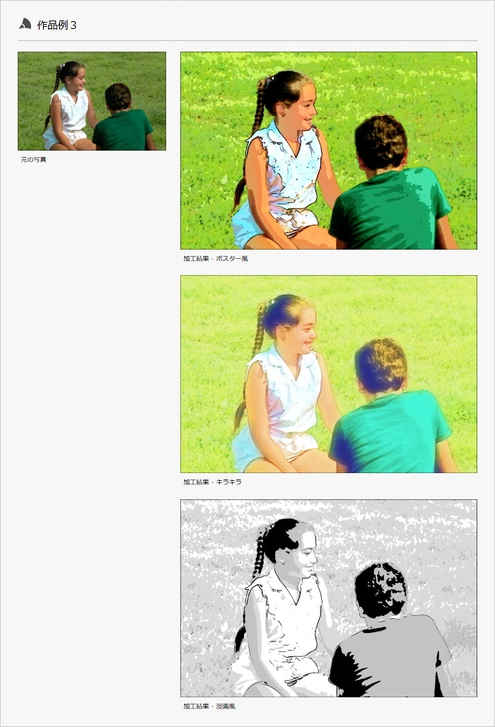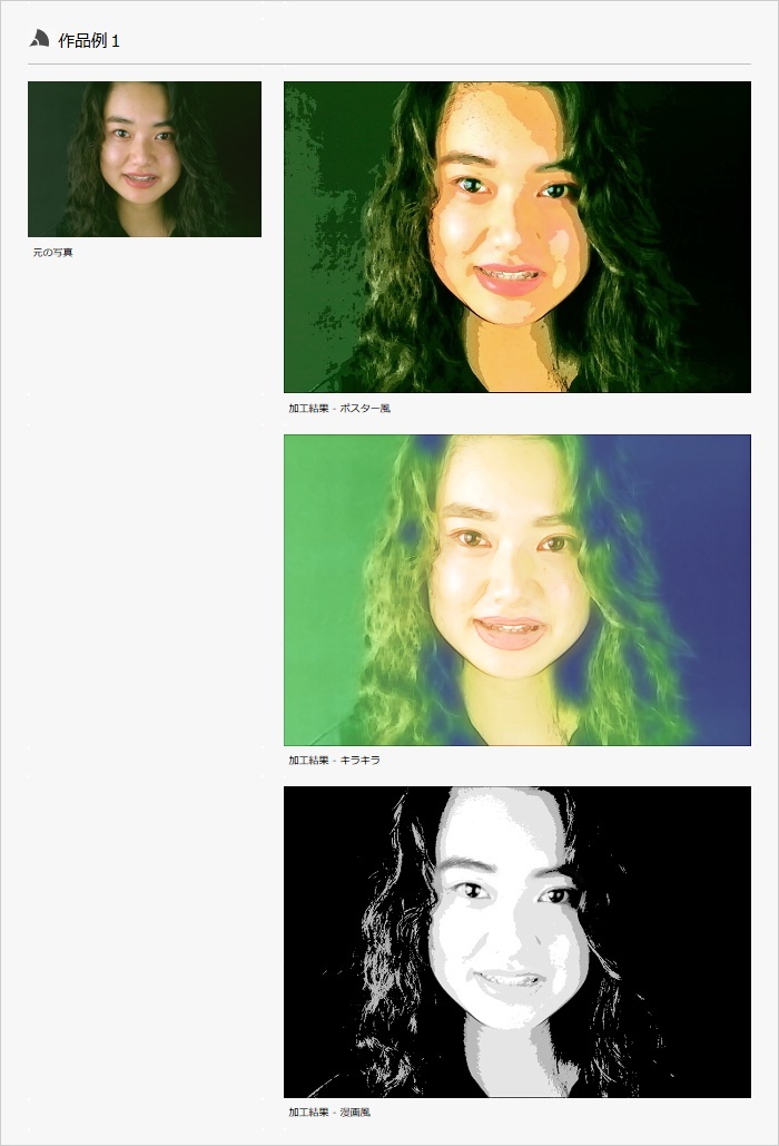 ■「似顔絵のプロ」は、写真を似顔絵風に加工できる写真編集ソフトです。 AI技術で顔を認識し、自動で加工できます。 ■こんな時におすすめ ・SNSやブログで映えるおしゃれな写真を作りたい ・プライバシー保護のために顔を少しぼかしたい ■簡単3ステップ 1.加工する写真を読み込む ドラッグ&ドロップか、「ファイルを開く」ボタンから写真を選びます。 2.調整 ポスター風、キラキラ、漫画風から3タイプの画風を選ぶことができます。 各々の画風で、輪郭線の濃さや色の濃淡を調整できます。 3.保存 加工した写真はJPEG、TIFF、PNG、BMPの形式で保存できます。 ■対応形式 入力:JPEG、TIFF、PNG、BMP 出力:JPEG、TIFF、PNG、BMP ■対応OS ・Windows 10/8.1 (32/64bit版) ■ご注意 ※ご使用にはインターネットによるライセンス認証が必要です。 ■詳しくはファンファーレ製品紹介ページまたはソースネクスト製品紹介ページをご確認ください。 |