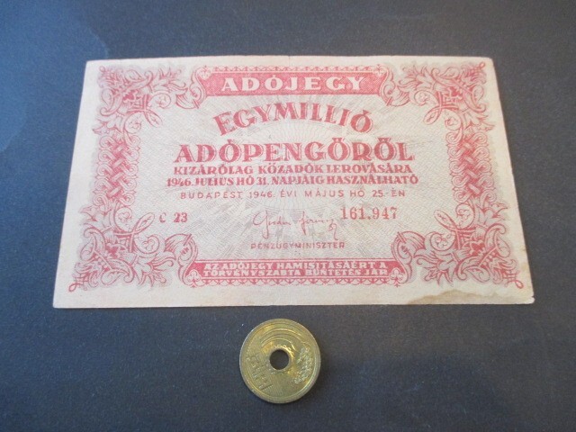 極美品 ハンガリー 1946年 超インフレ 納税通貨 100万アドペンゲ P-140b(3)