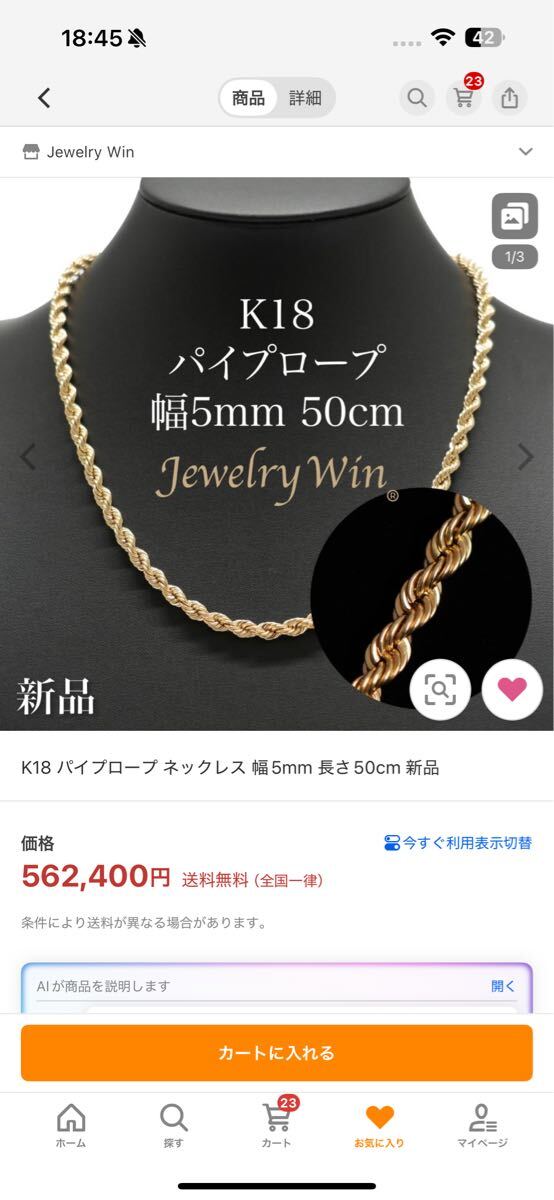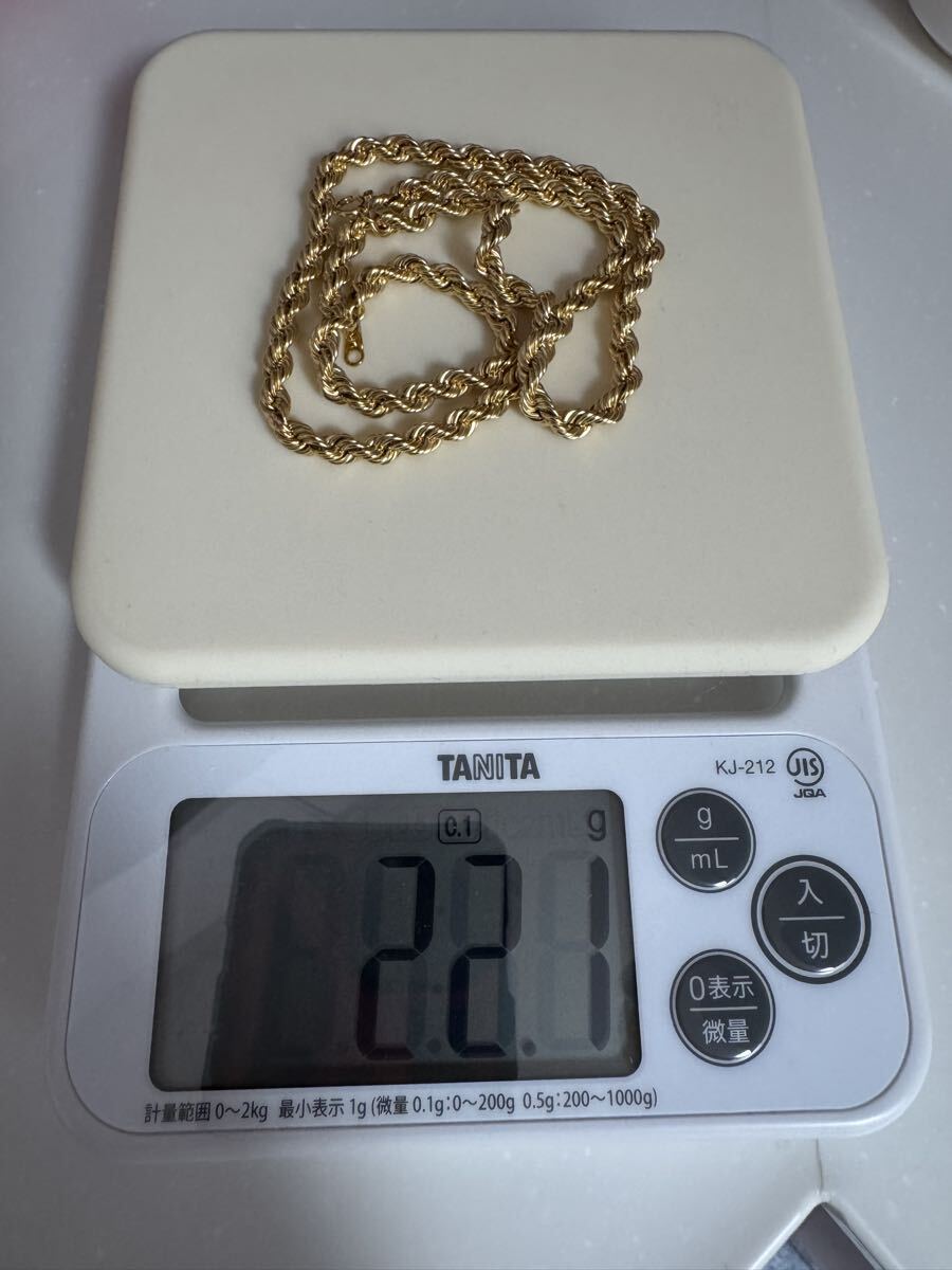 K18◆パイプロープチェーンネックレス◆太さ5mm◆長さ50cm◆18金◆18K