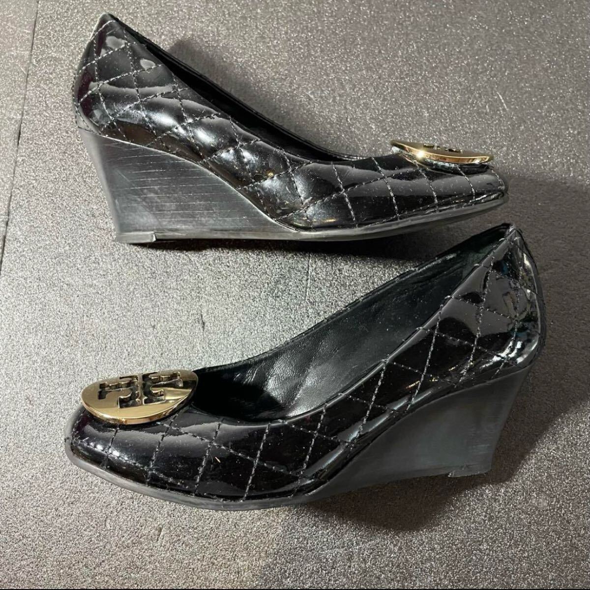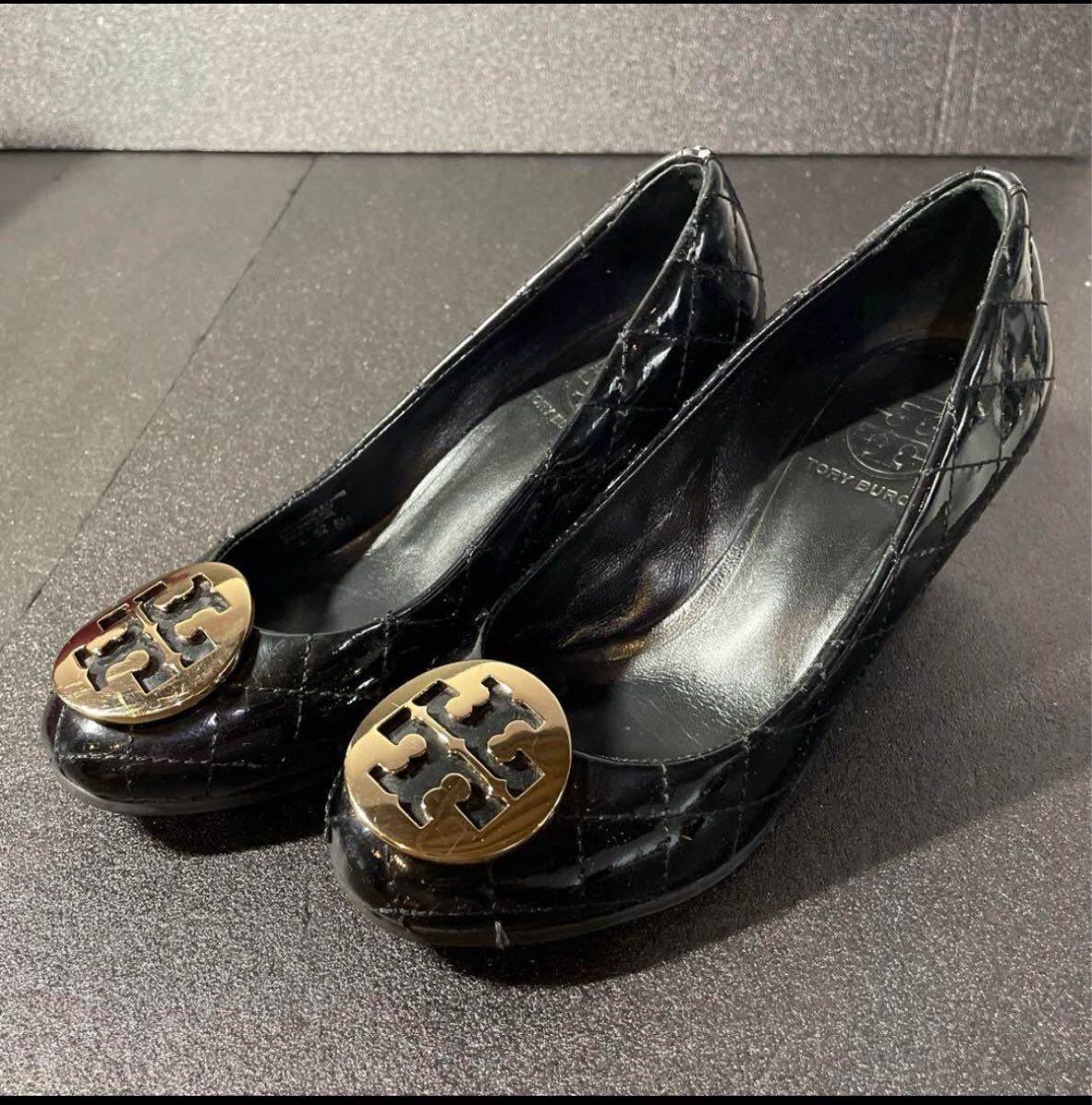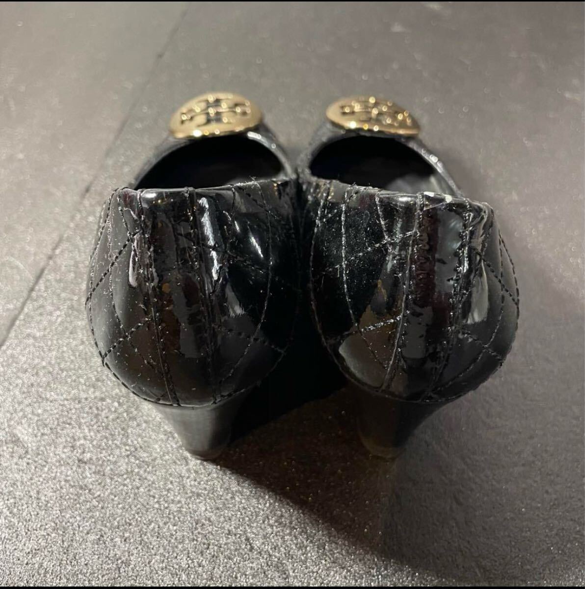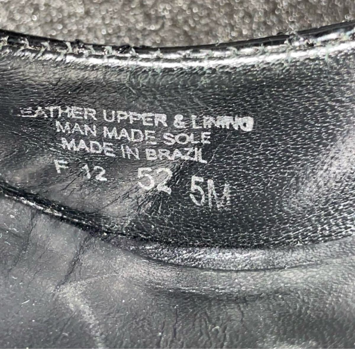 ロゴ付きのブラックパテントレザーシューズ、オリジナルボックス付き。