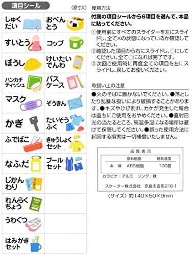 持ち物を分かりやすくチェック ランドセルにつけて毎朝チェック 項目シール24枚(イラスト入り20枚/無地4枚付 付属の項目等のシールから6項目を選んで本体に貼って使用 使用前にスライダーを左にスライドして、全ての状態を確認してから使用