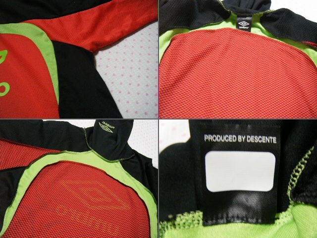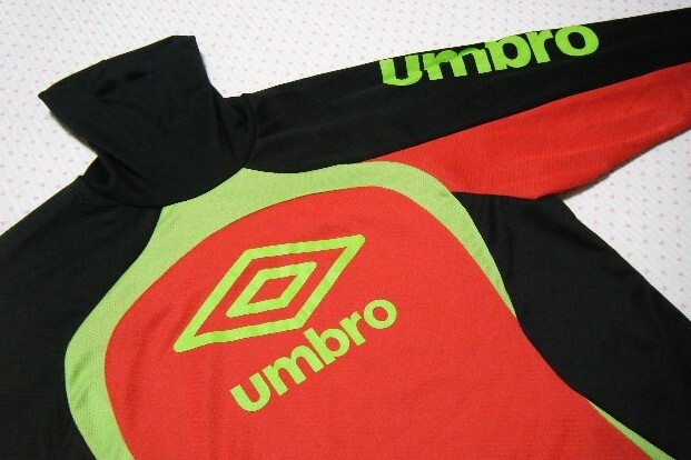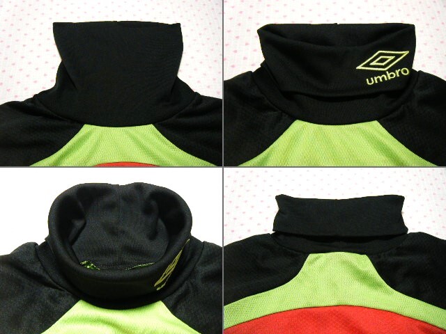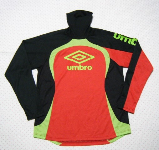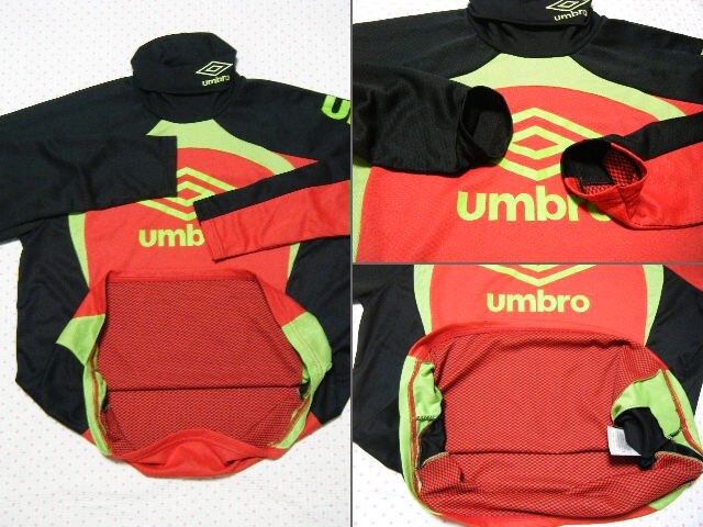 本体は軽量ポリエステル素材。   本体は複数のカラーでブロック構成された軽量薄手のメッシュストレッチ生地で、全面に積極保温機能素材 「HEAT NAVI バックブロックニット」 を採用 したトレーニング用高機能/保温ハイネックシャツ・プラクティスシャツ。   ロングスリーブモデル。   カラーブロックごとに異種の通気メッシュ素材を使用。   @ タートルネック仕様で折り返して着用するとロゴ刺繍がアクセントになるデザイン。     胸のロゴ文字はプリント。    ネックのロゴマーク、文字は刺繍。     モデル名 アンブロ ウルトラハイネックプラクティスシャツ    カラー レッド × ブラック × イエローグリーン