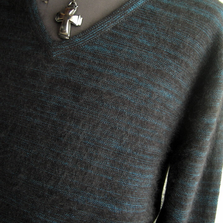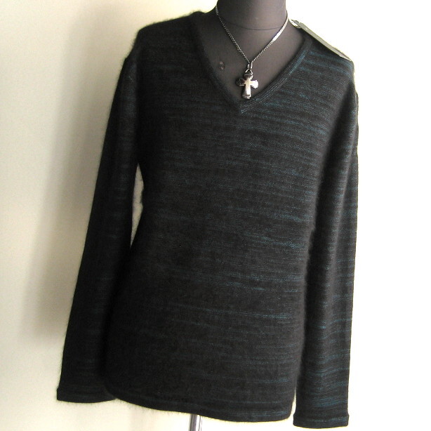 ■メタリックな光沢のあるレーヨンと縮絨されたウールがミックスされたVネックニット