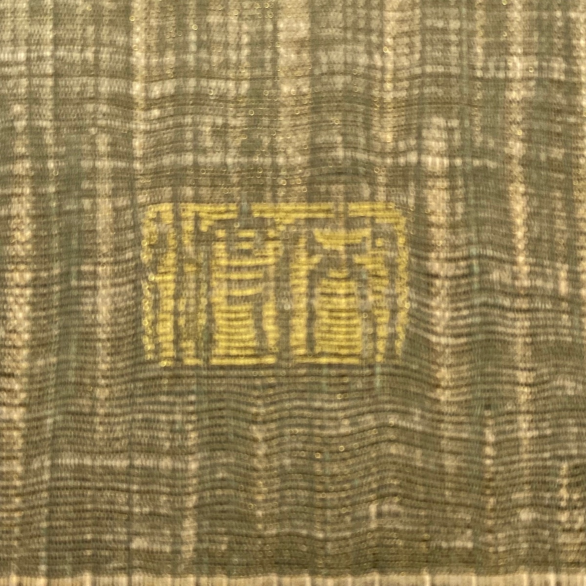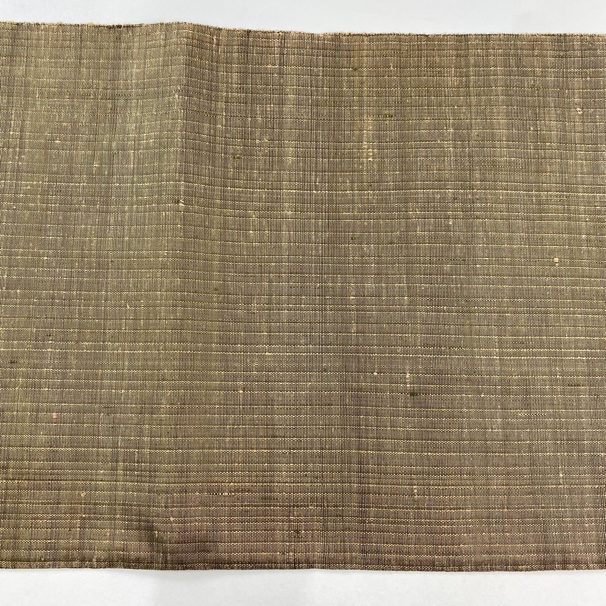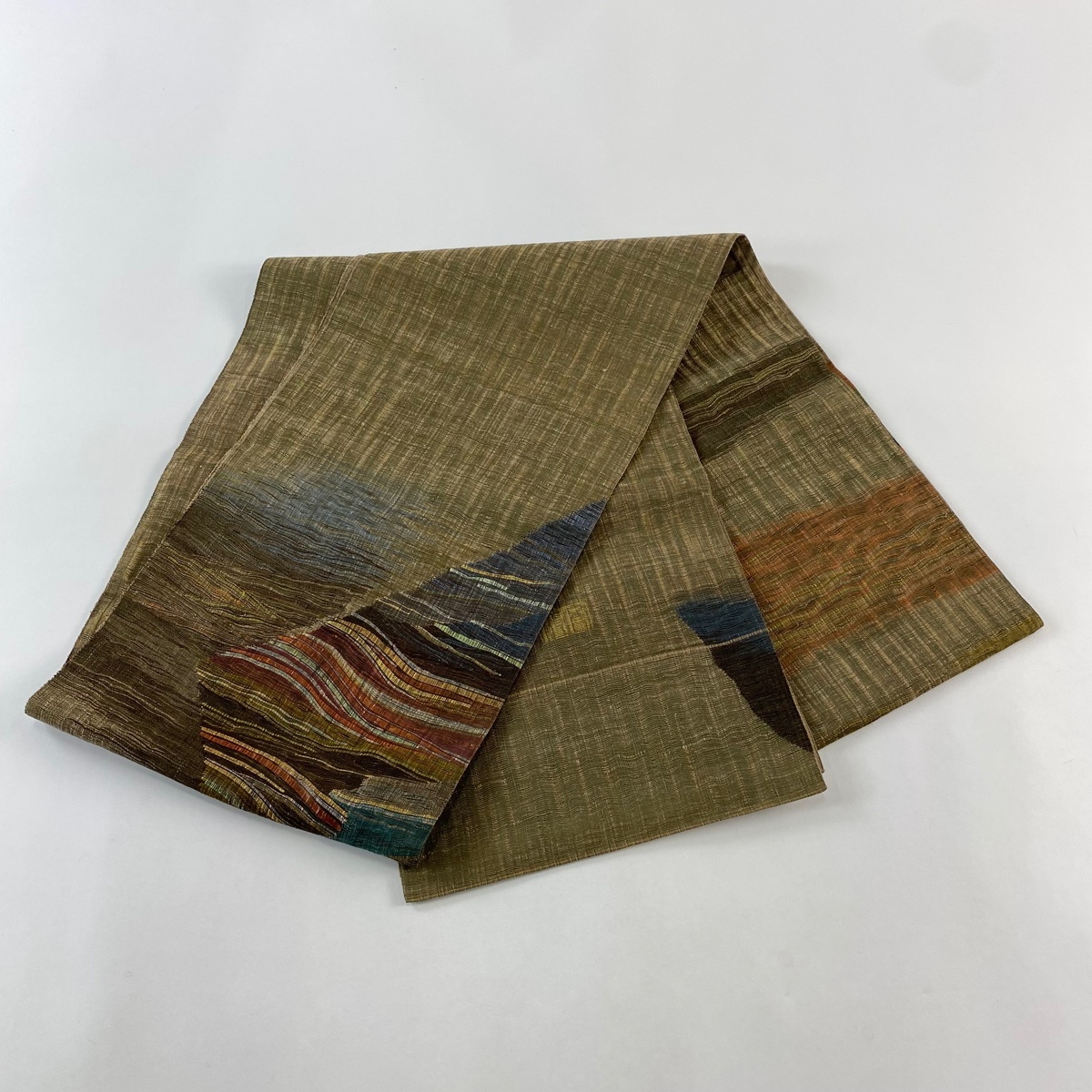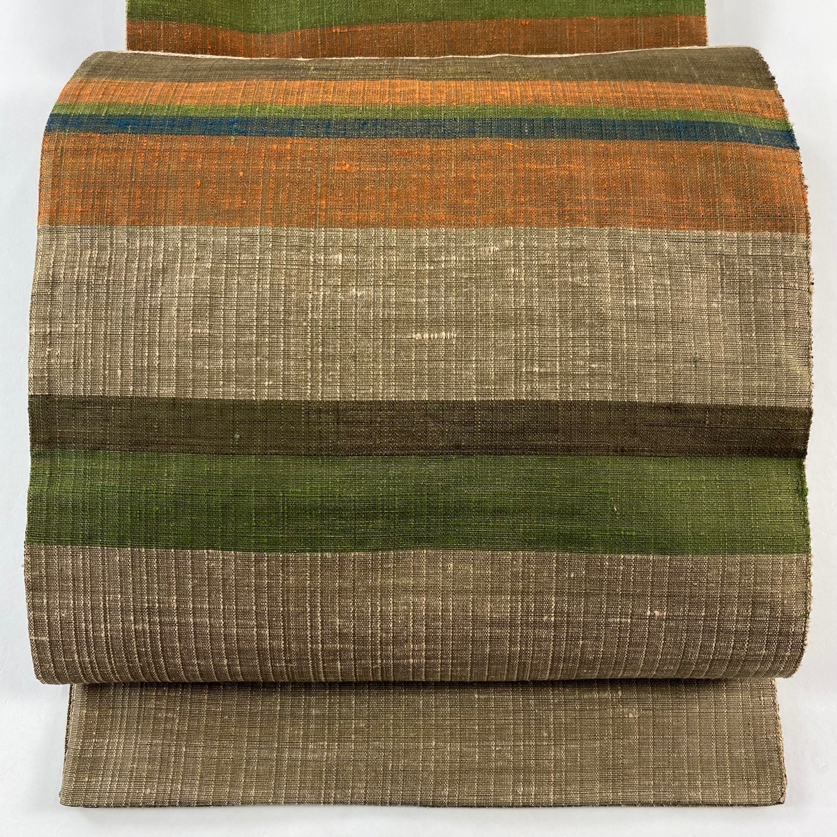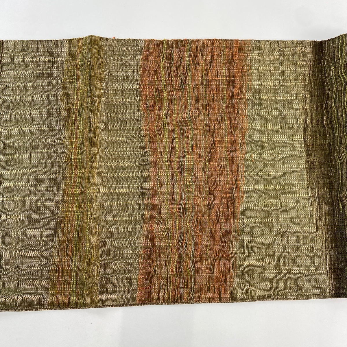 | 袋帯 美品 名品 渡文 落款 八寸名古屋帯 リバーシブル 波 幾何学模様 金通し 箔 茶緑色 お太鼓柄 正絹 【中古】 |