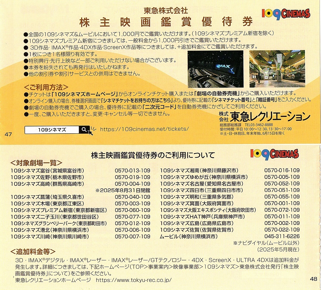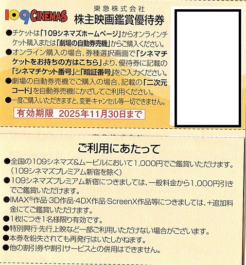 109シネマズ 株主優待券 割引券 2枚set ~9組迄 2025年11月末迄有効 東急電鉄 メール通知可 ムービル可