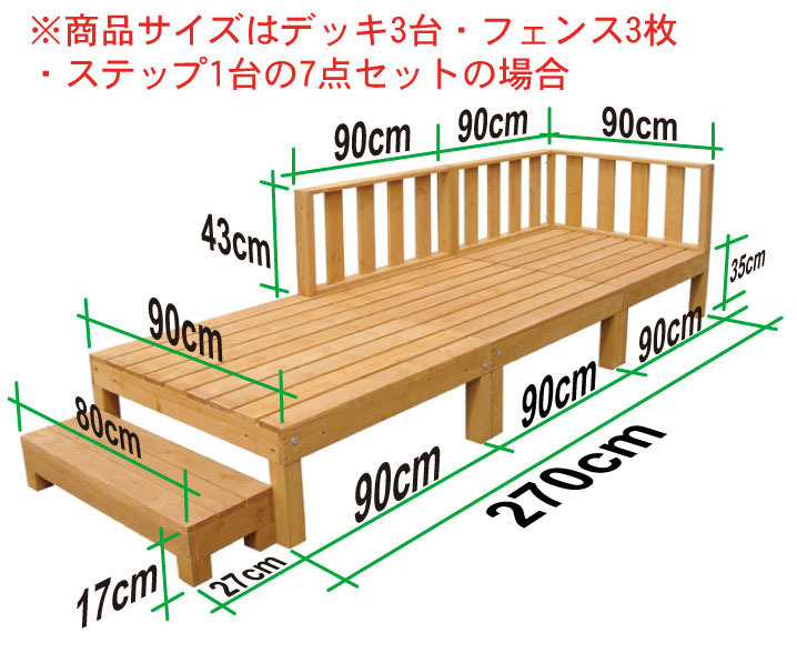 商品寸法(単位mm):デッキ・幅900×奥行900×高さ350~370(アジャスターで高さ調整可能です。)/1台 フェンスコーナー・横800×幅67×高さ430/1枚 フェンス延長・横900×幅67×高さ430/1枚 ステップ・横820×奥行270×高さ170/1台