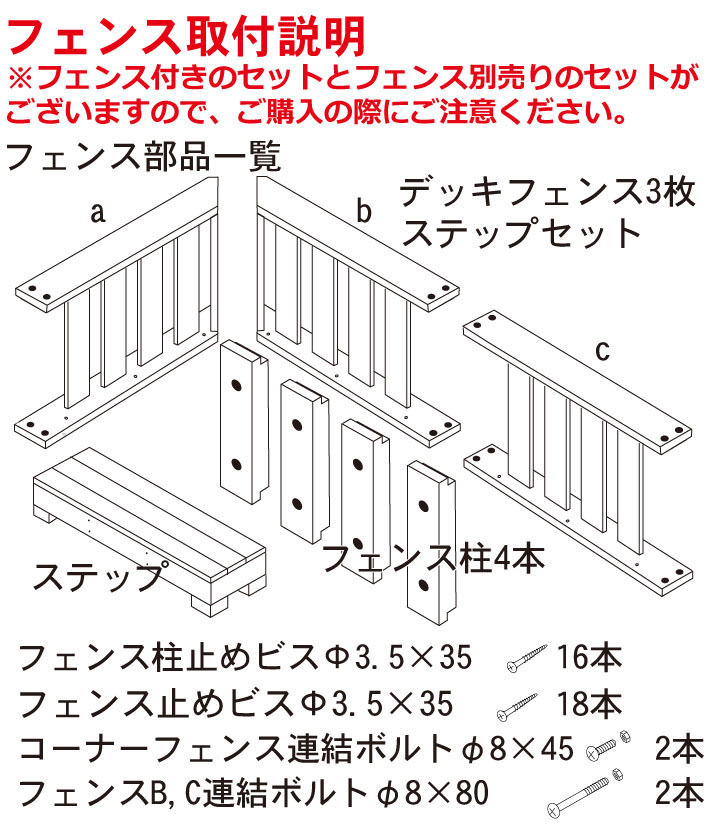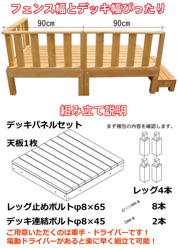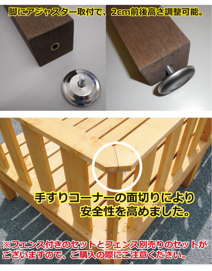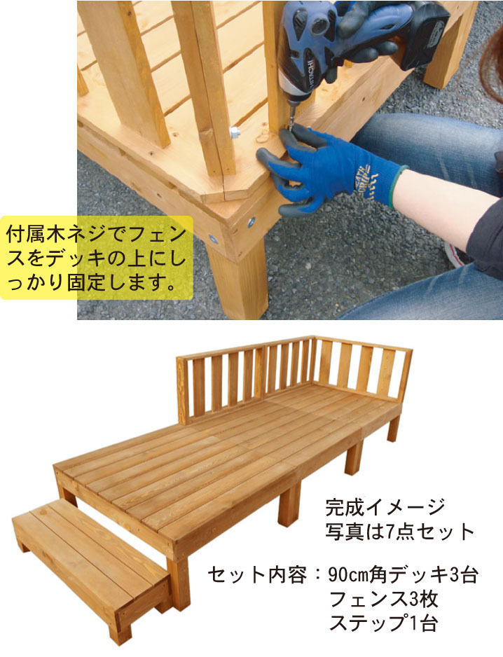 セット内容:90×90cmデッキ×6台・フェンス×3枚・ステップ×1台
