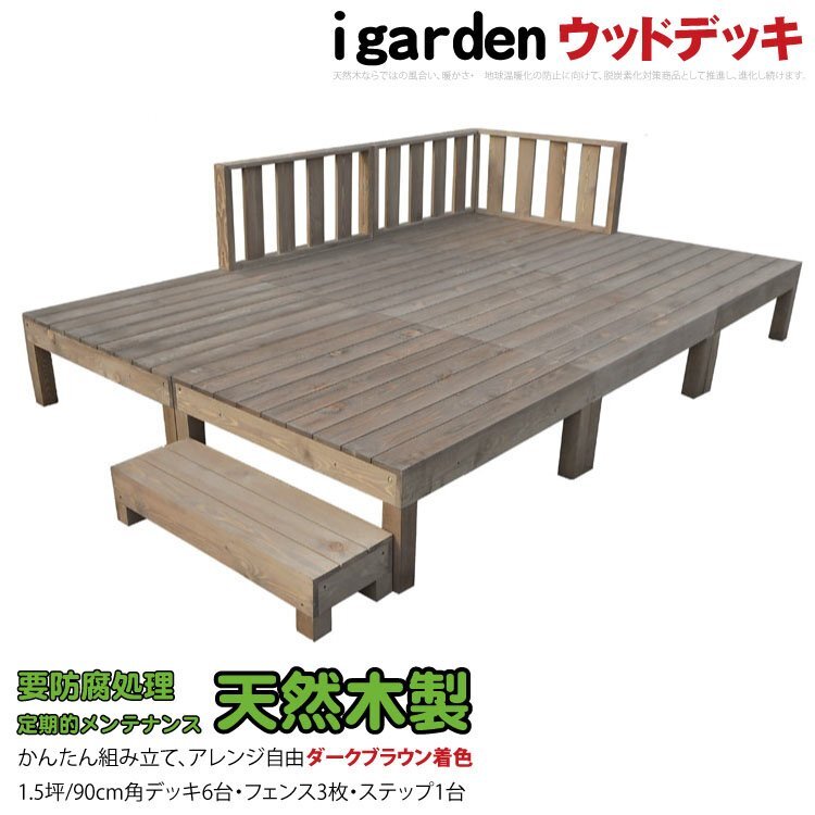 igarden 天然 木製 ウッドデッキ 90×90 10点セット(デッキ6・フェンス3・ステップ1)1.5坪 ダークブラウン 縁側 DIY 庭 -6d3f1sdb