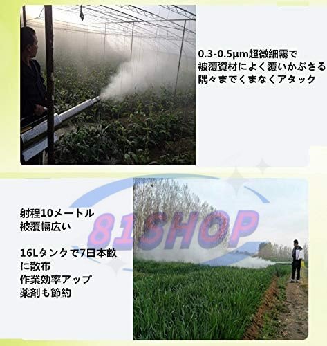 【作業時間を短縮】:動噴噴霧器が15分間で16Lタンクを散布完了。【薬剤節約】:噴霧機の16Lタンクが7日本畝の面積を散布。【簡単始動】:噴霧器がバッテリー方式なのでスイッチだけ押してオンになり、女性でも簡単始動。ミスト機の始動ビデオ:https://youtu.be/c1HahV8QFZs電池装着ビデオ:https://youtu.be/pDfgLRsYW-Q