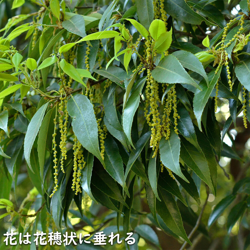 シラカシは綺麗な緑が特徴で生垣によく使われる樹種です。アラカシと比べて樹形が大人しく、葉が細いです。秋になるとかわいい帽子をかぶったドングリを10月ごろに実らせます。一年中緑色の綺麗な葉が付いています。風に強く防火性も高いために、古来から家を守る為に生垣や防風林に使われたりします。自然樹形が非常に綺麗なためシンボルツリーとしても使われます。