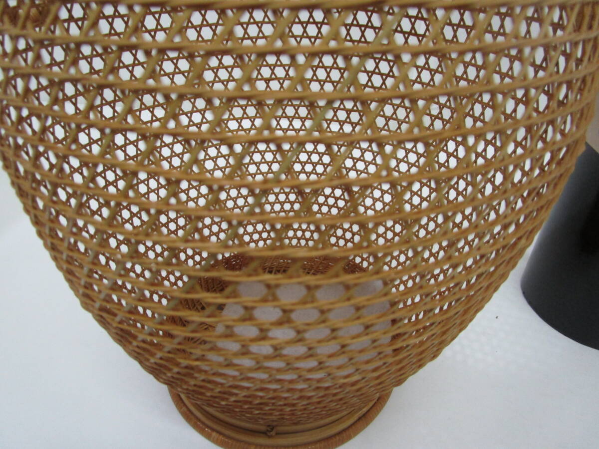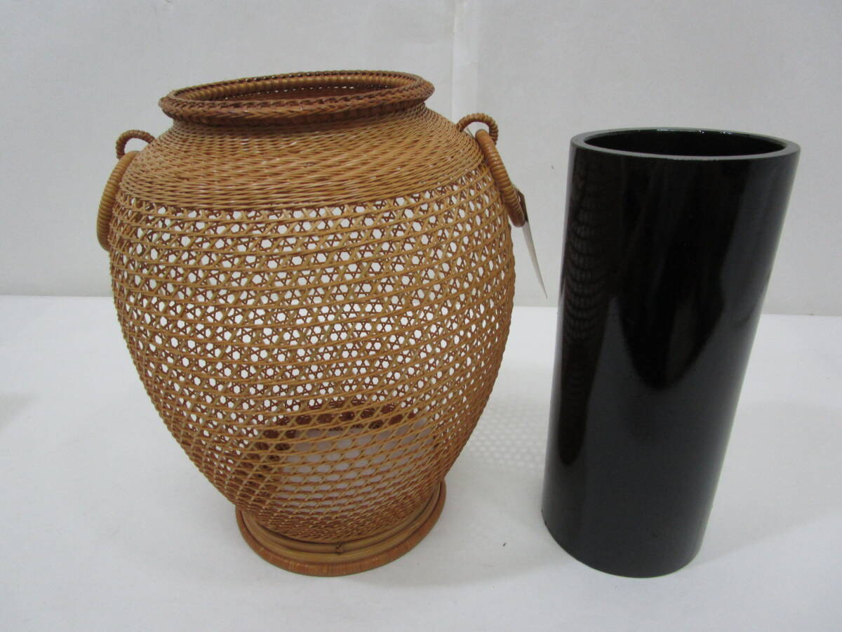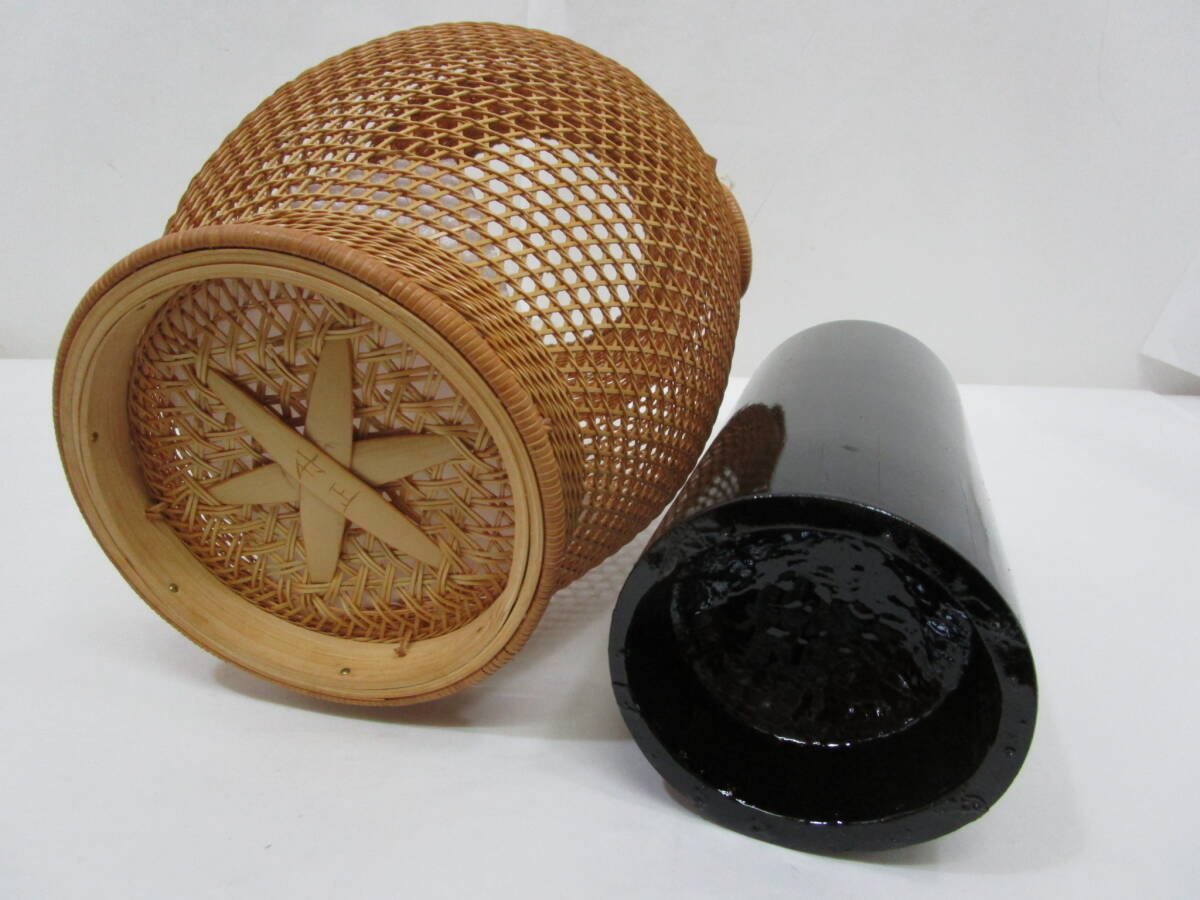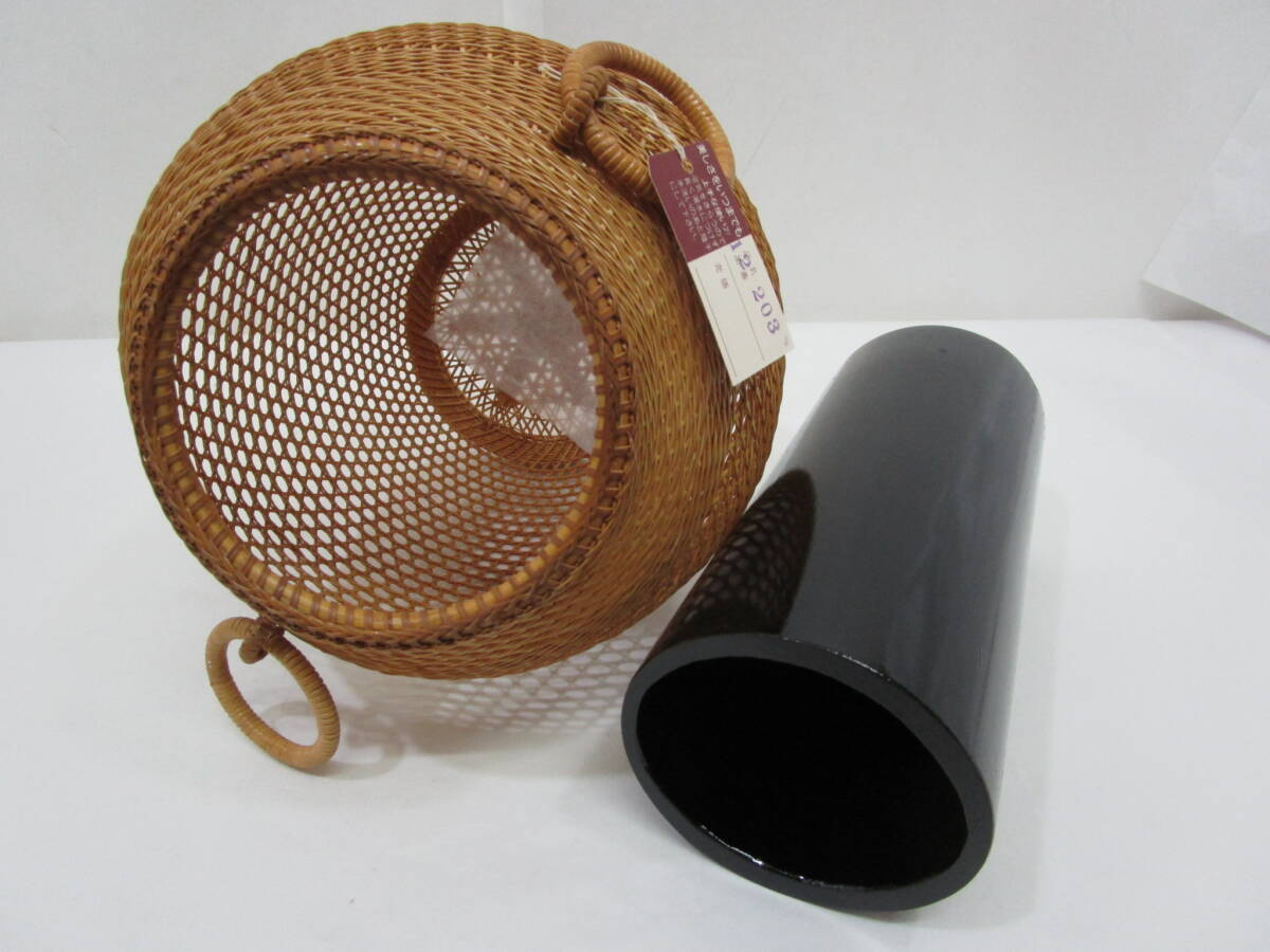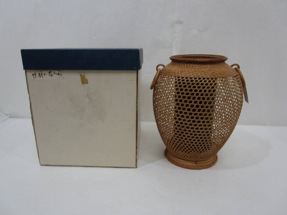 中古籠花生!竹工芸家 竹正作 TOP BANBOO 手づくりの 耳付 「環付」 花籠です。 サイズ:胴計21cm(口径11cm)×高さ27.5cm 竹オトシの内径8~9cm×深さ20cm 経年で化粧箱はヤケ汚れています。 即決品です。 どうぞ宜しく。