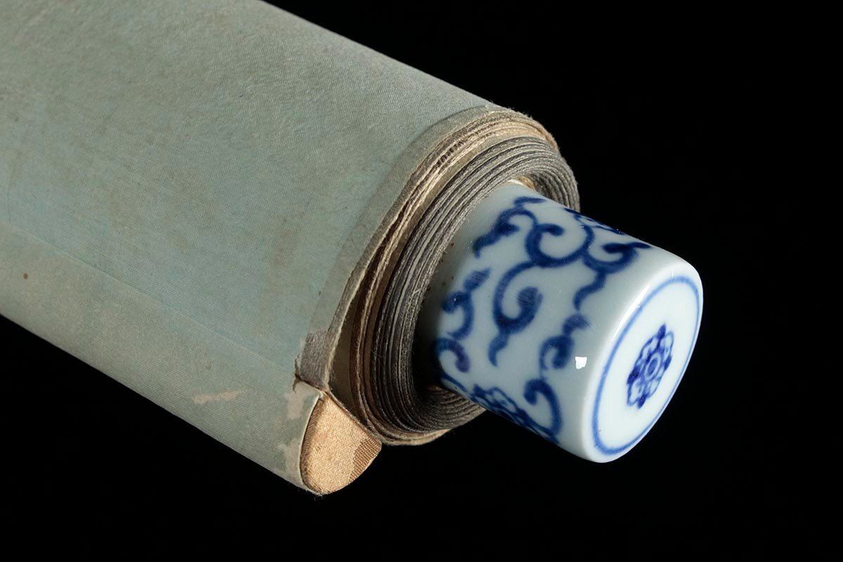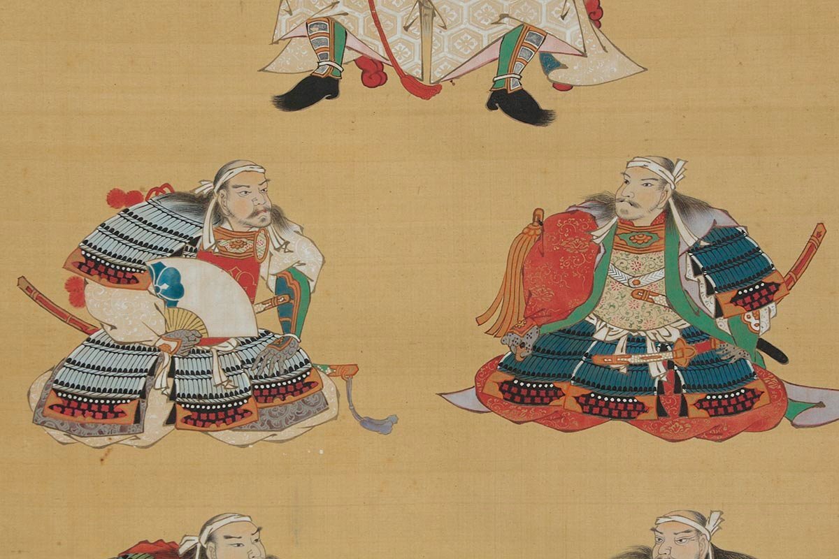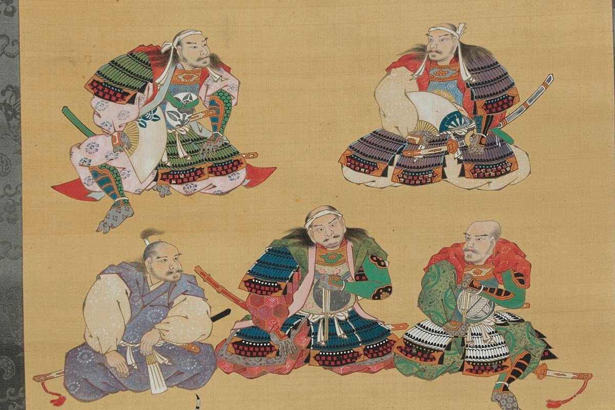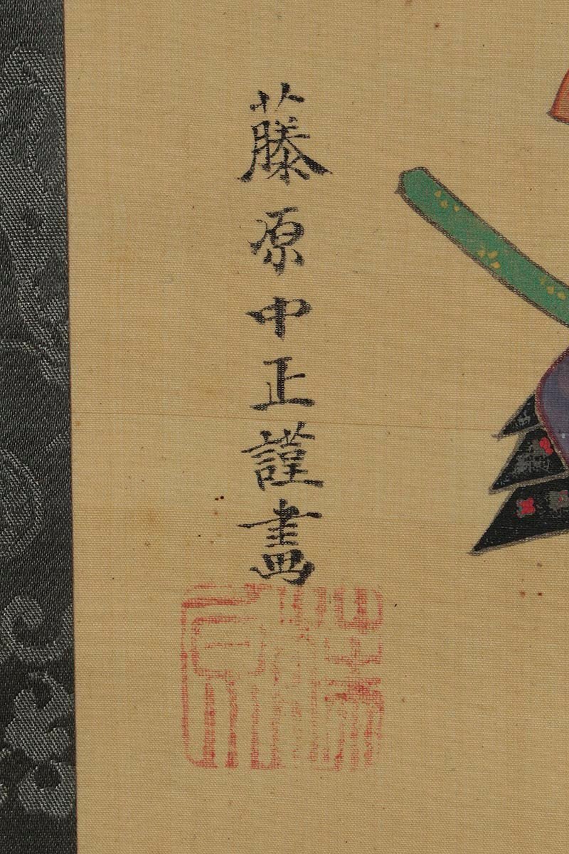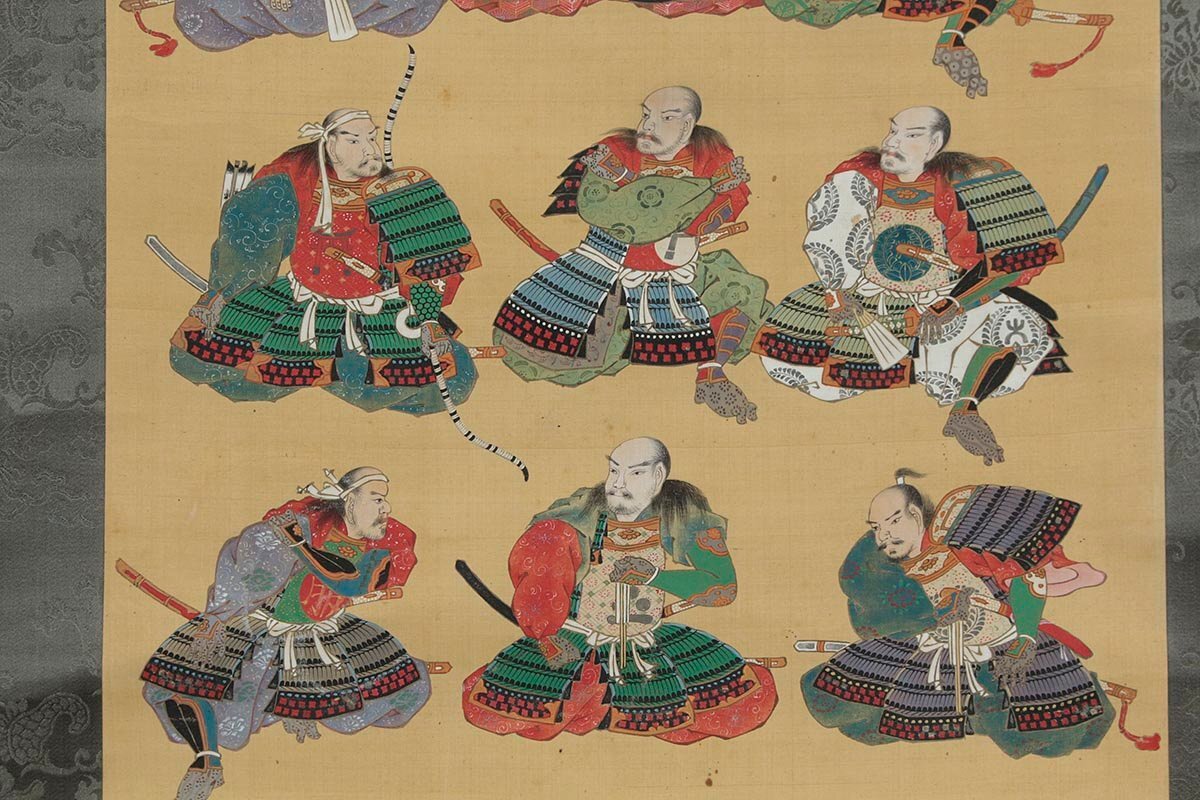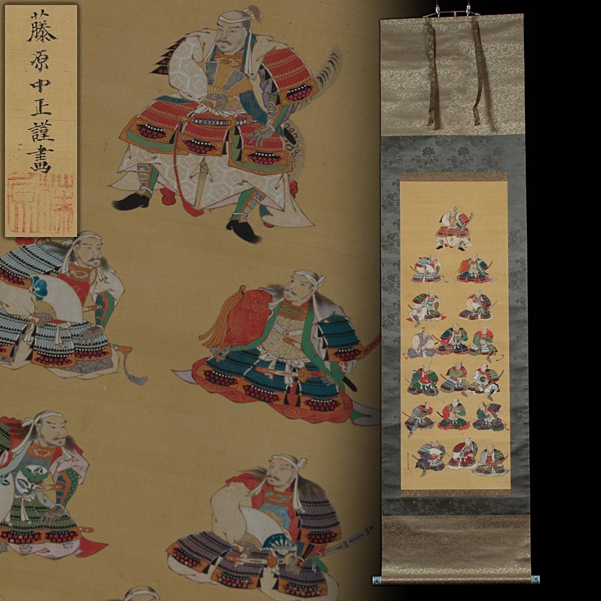 ◆ 時代物【藤原中正謹畫】染付軸先 絹本着色「徳川十六神将図」掛軸 全縦191cm 本縦102.5cm 古美術品 ◆