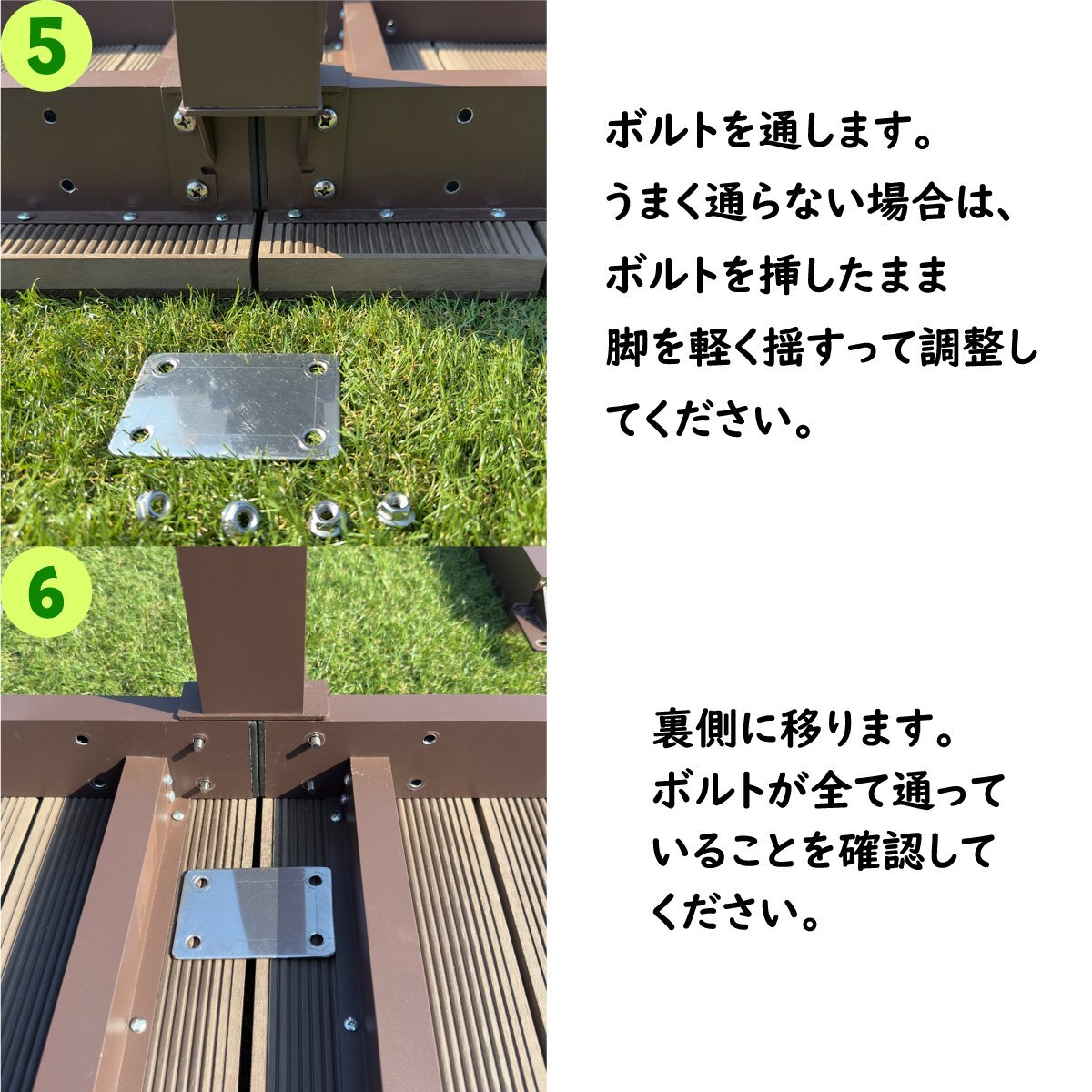 材質:(脚・枠)アルミ・(アジャスター)強化プラスチック・(座面)アイウッド樹脂木・(組立ボルト)ステンレス