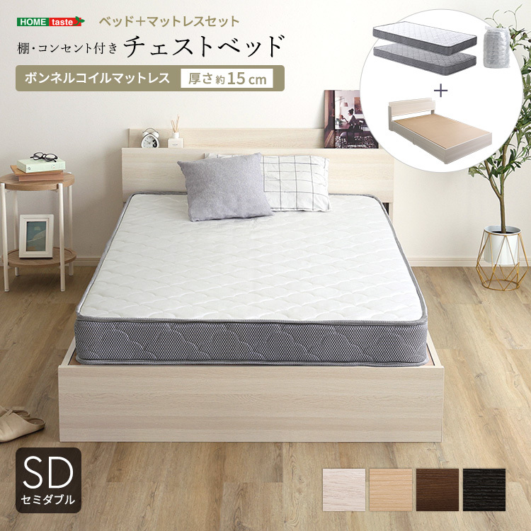 棚・コンセント付きチェストベッド ボンネルコイルマットレスセット(セミダブル) オーク/シルバー