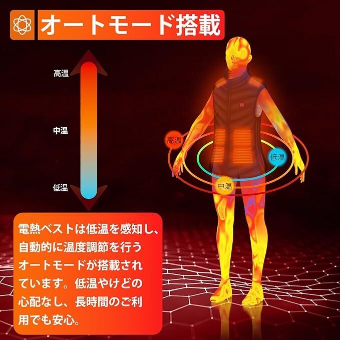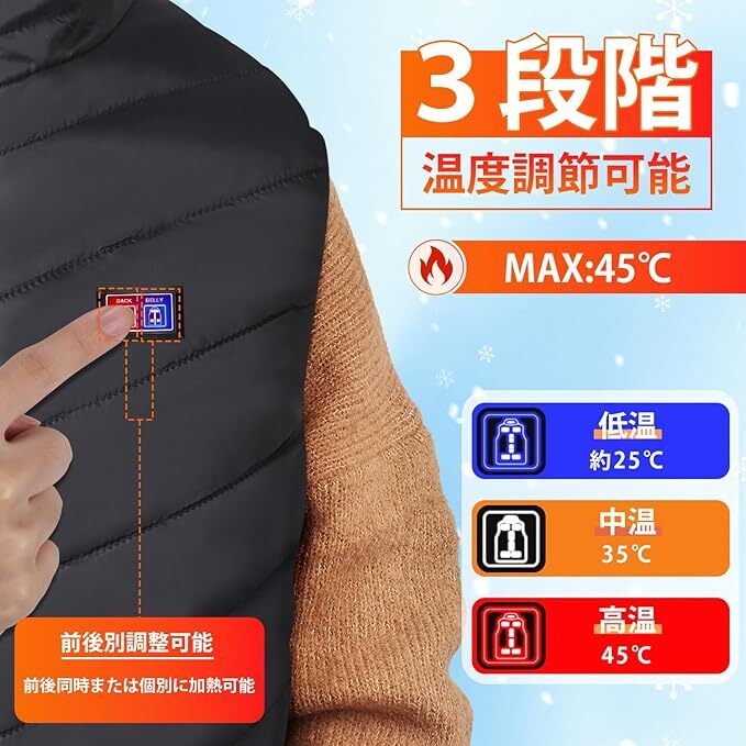 電熱ベスト ヒーターベストMサイズ 前後15箇所発熱 前後独立温度調節 三段階温度調節 速温 防寒対策 男女兼用 水洗い可 節電 省エネ