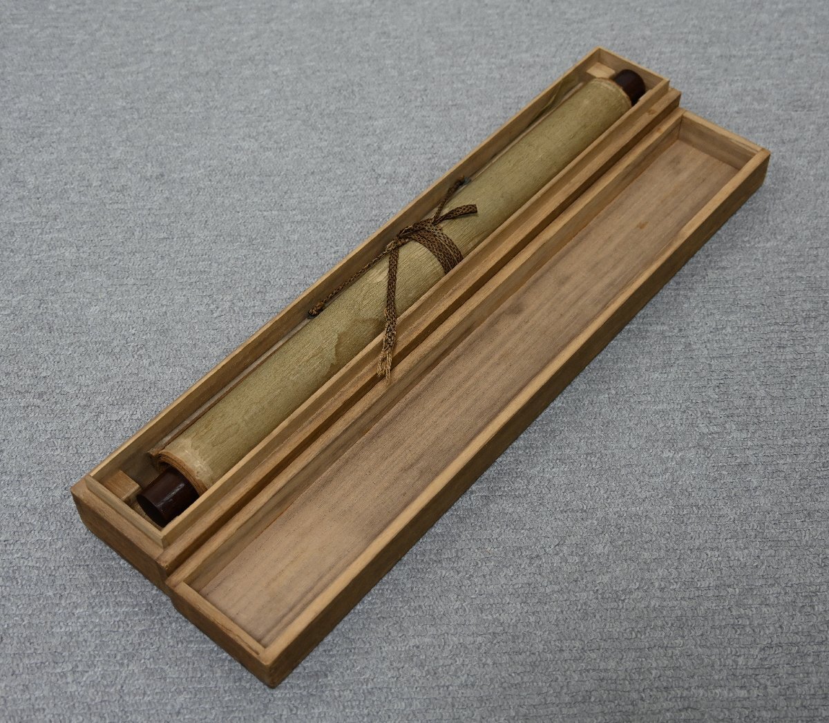 【サイズ】 本紙:102 × 30.9cm 総丈:187.7 × 50.8cm 【状態】 本紙シミ・イタミ有。箱が付きます。 ※骨董品ですので、経年による劣化損傷等に神経質な方の入札はご遠慮願います。 ※写真で状態をよくご確認の上ご入札ください。 |