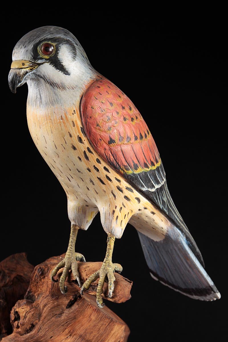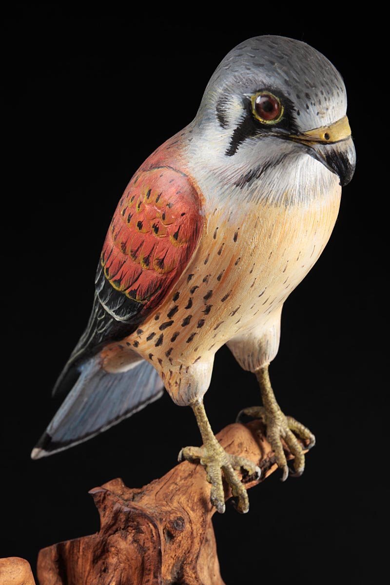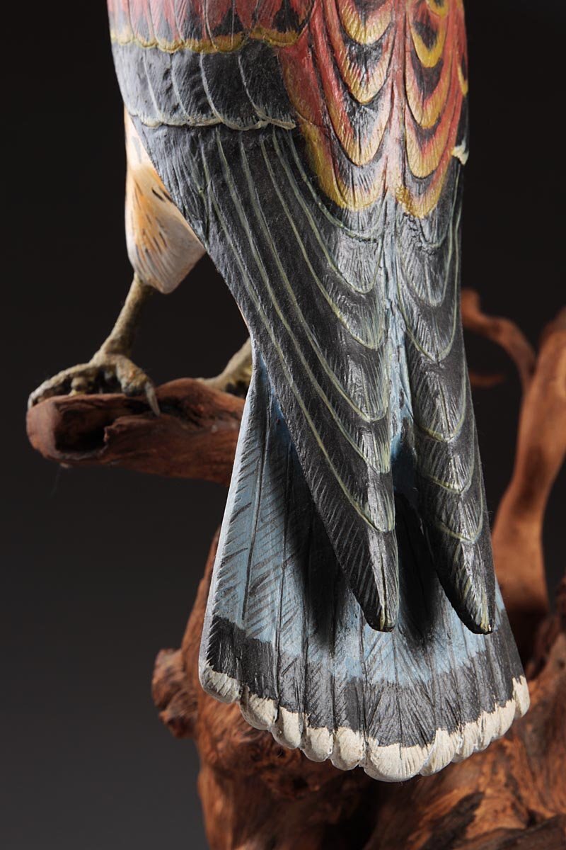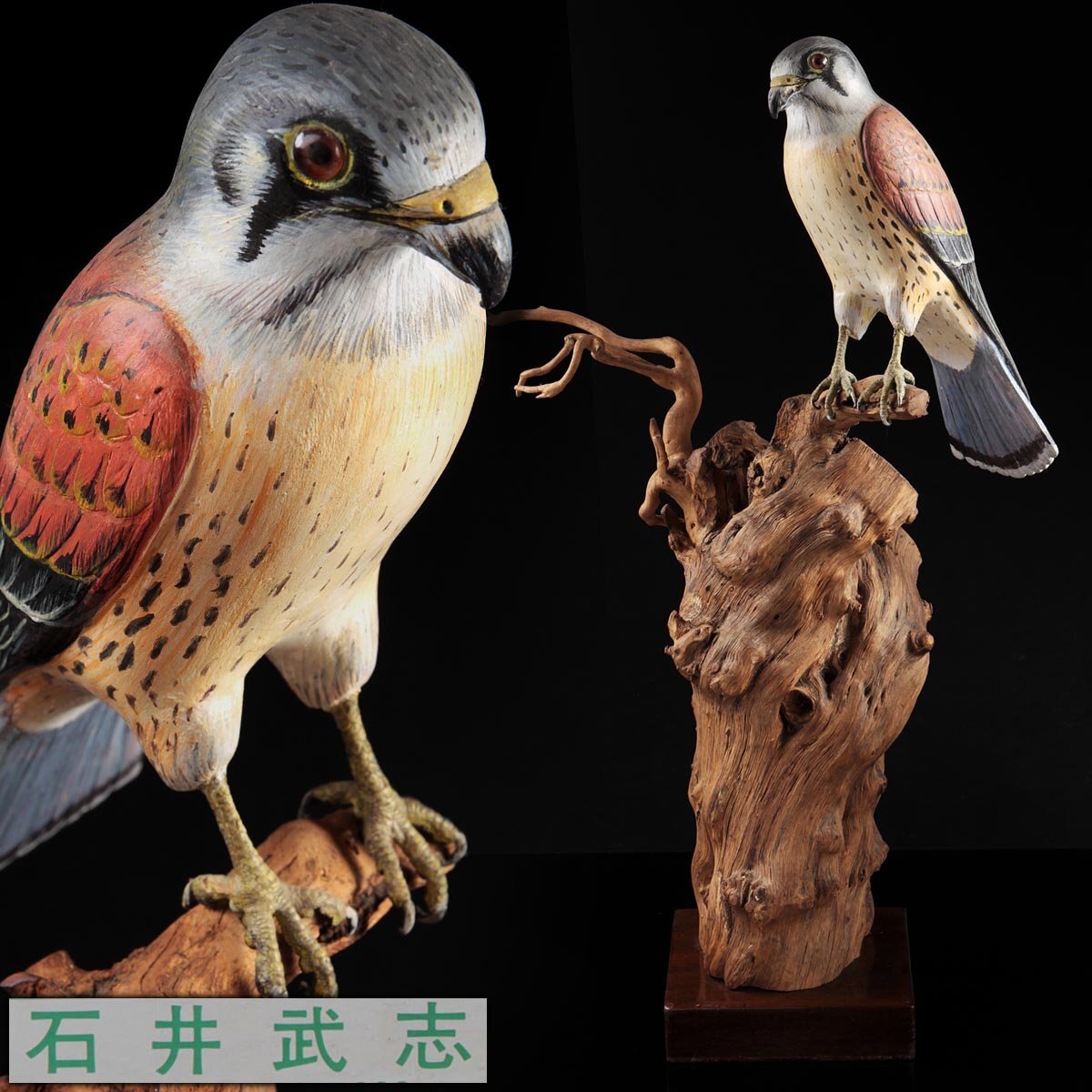 | ◆ 【石井武志 作】木彫野鳥 木彫彩色「チョウゲンボウ/長元坊」置物 天然木根台付 床置 床飾 バードカービング ◆