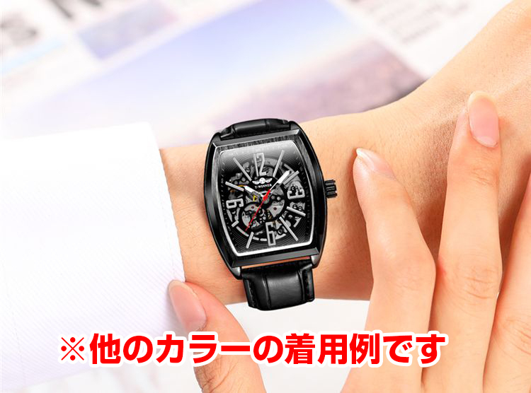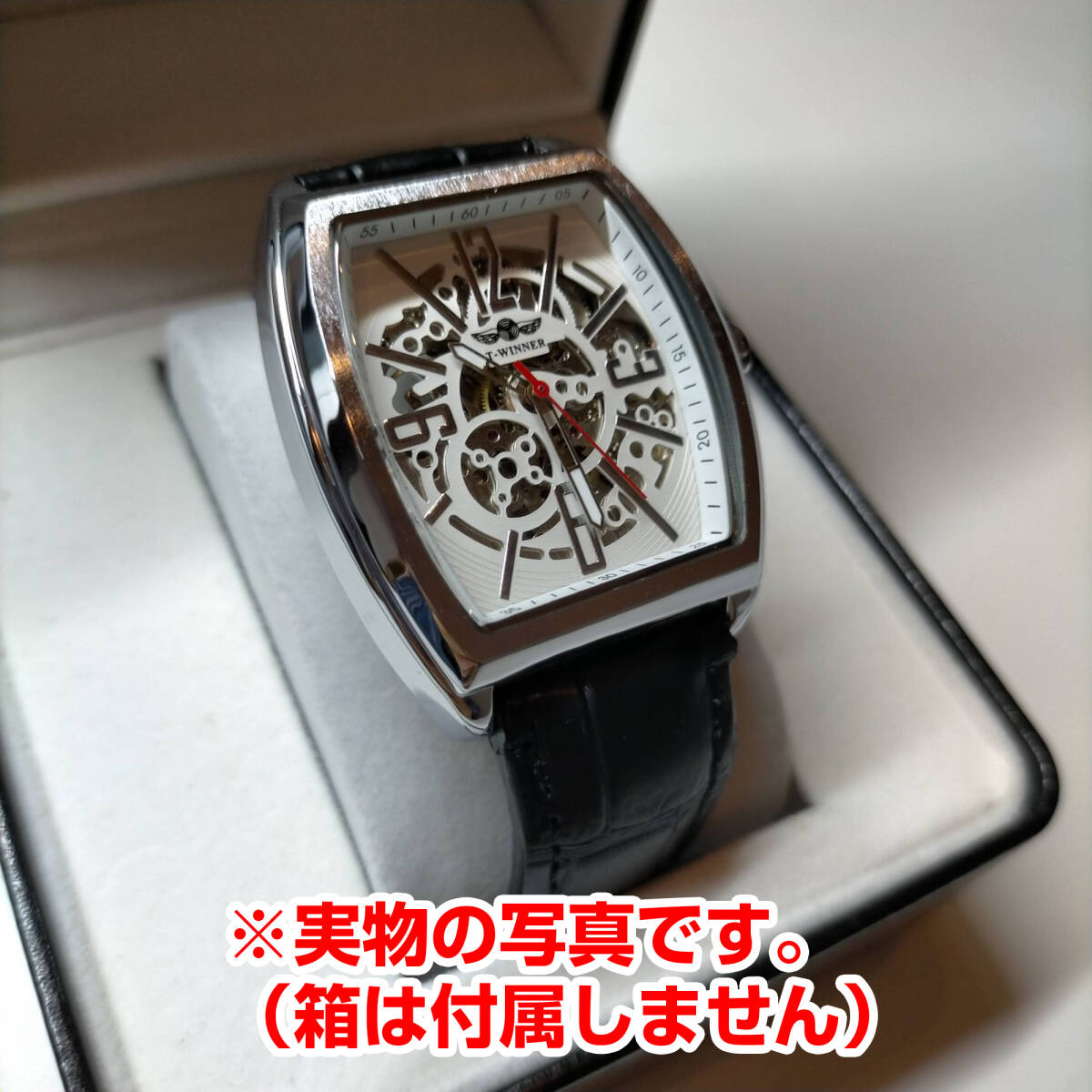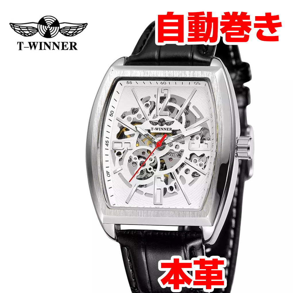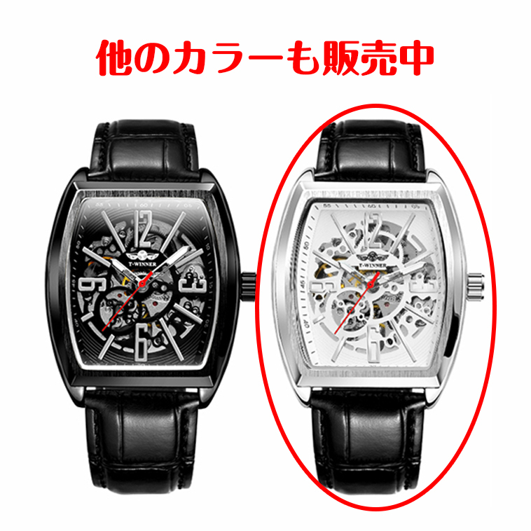 Winner社メンズ腕時計 自動巻き 角型スクエア ブラック黒本革レザーxホワイト白xシルバー銀 (フランクミュラーではありません)