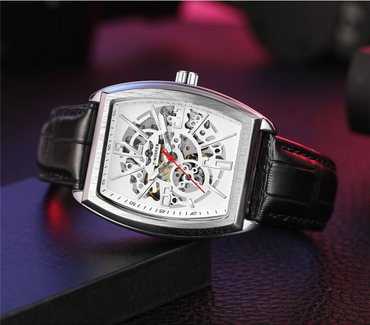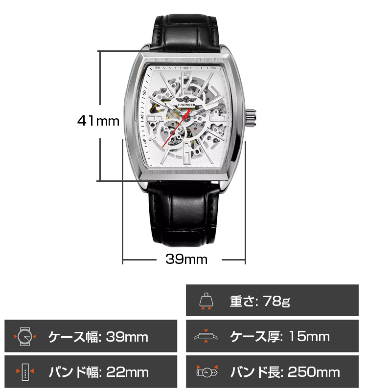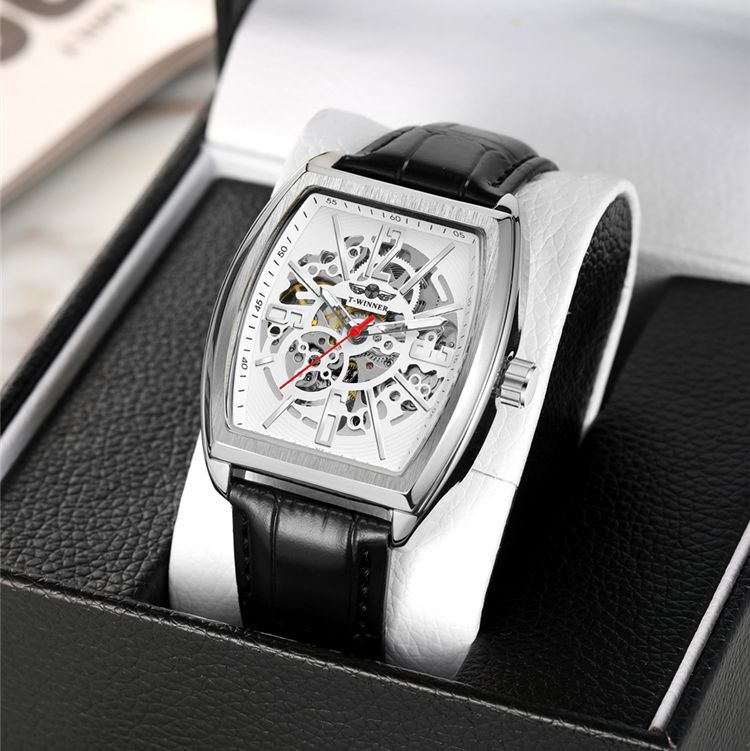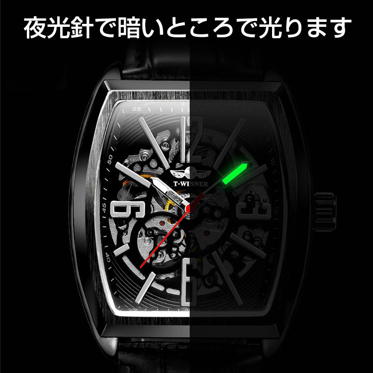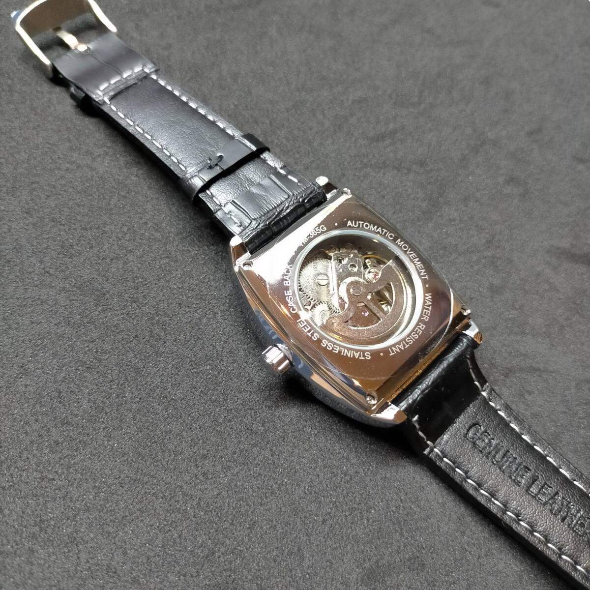 Winner社メンズ腕時計 自動巻き 角型スクエア ブラック黒本革レザーxホワイト白xシルバー銀 (フランクミュラーではありません)