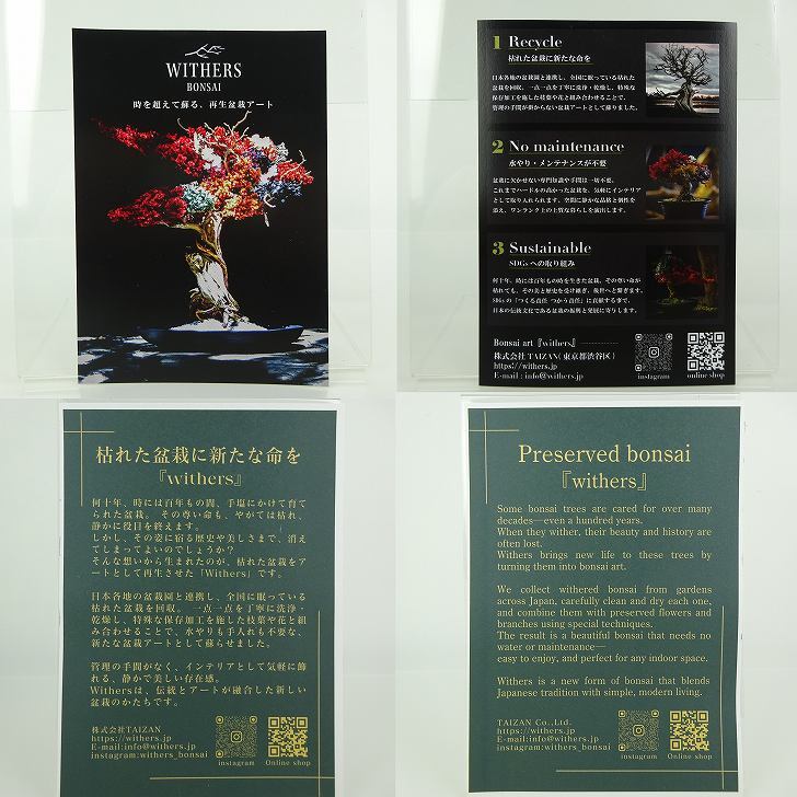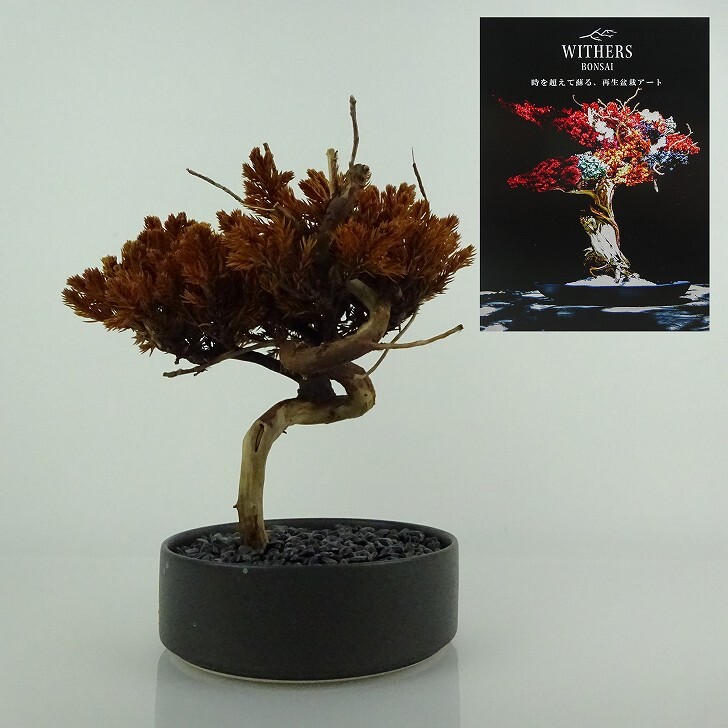 | 【withers bonsaiとは】 破棄されてしまう枯れた盆栽を回収し、その美しい樹形をそのままドライ化する事で、枯れない盆栽アートとして再生しました。 独自の保存技術により葉や花は乾燥させる事なく、自然に近い状態を保ったまま室内にて鑑賞頂けます。 |