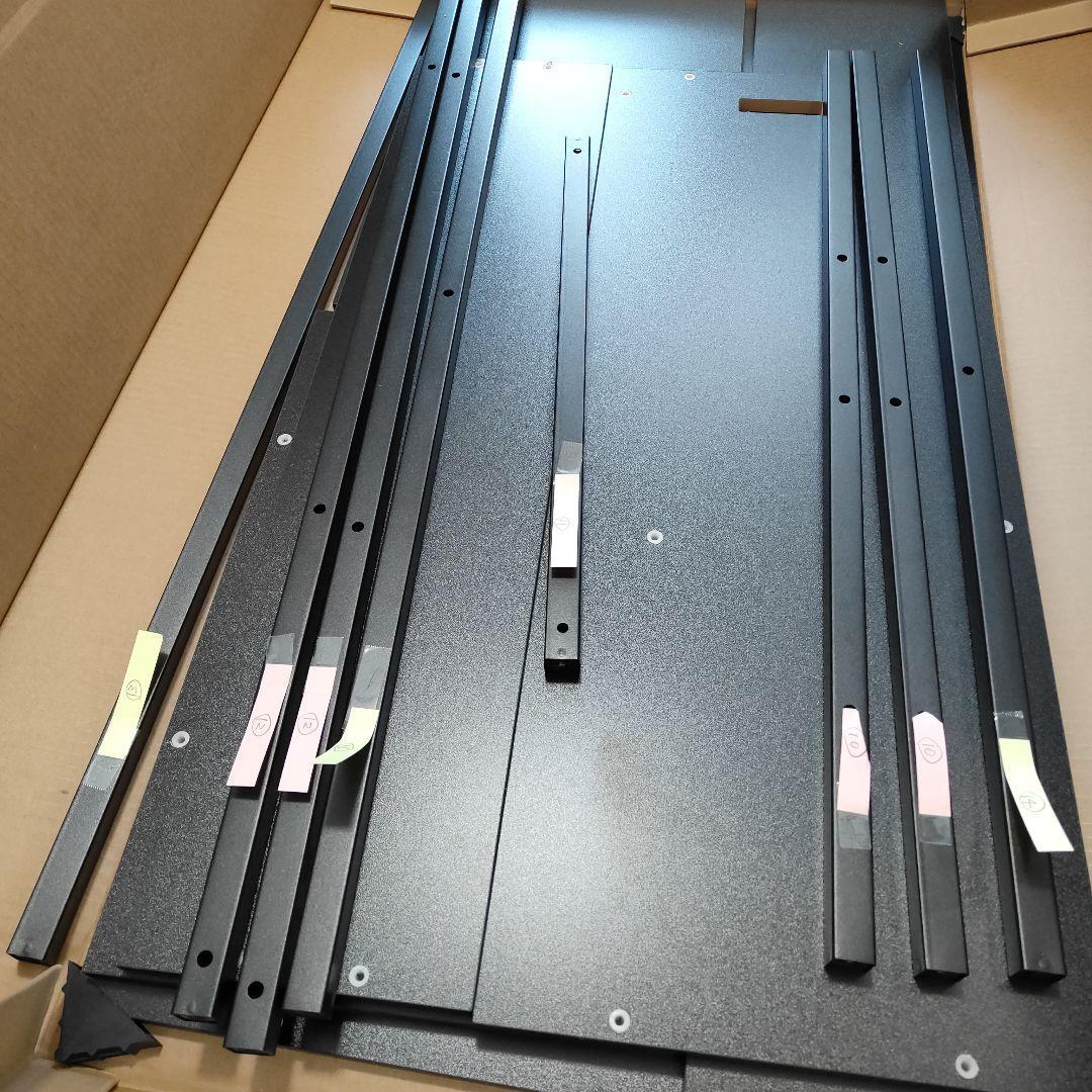 天板や棚板はネジ止めで固定され、長く使っても緩まないのがポイント。スチールフレームは2箇所で強度を上げるサポート。