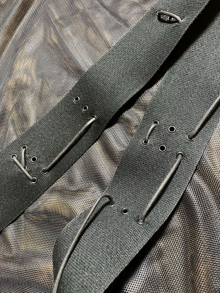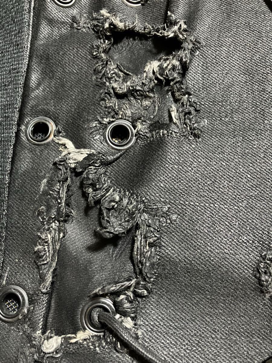 デストロイデニムと同様のブラックコーティング加工にデストロイダメージ加工 勿論あて裏地布もあります。