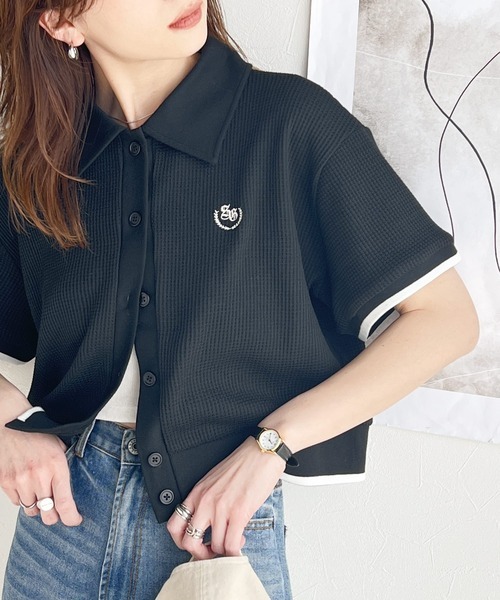 参考商品名:大人レディな正統派。胸刺繍ワッフル短丈ポロカーデ